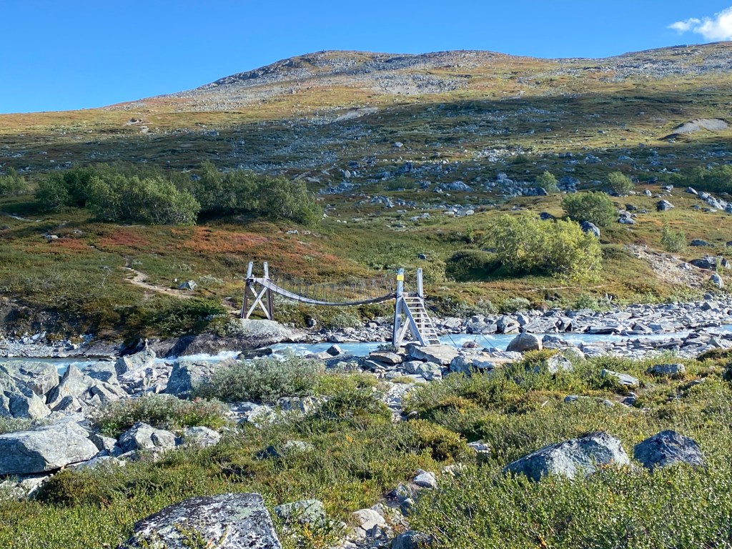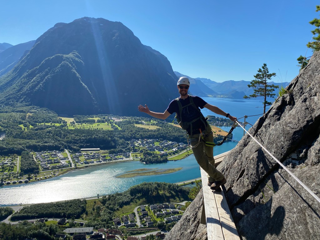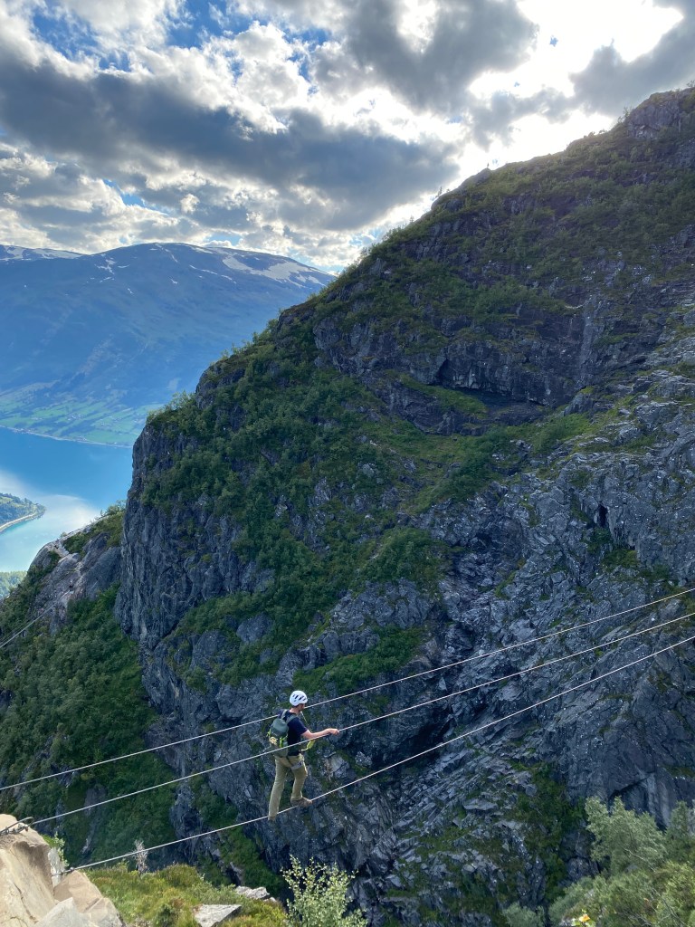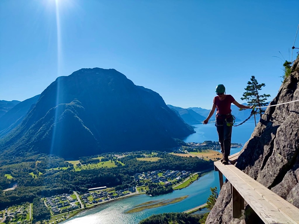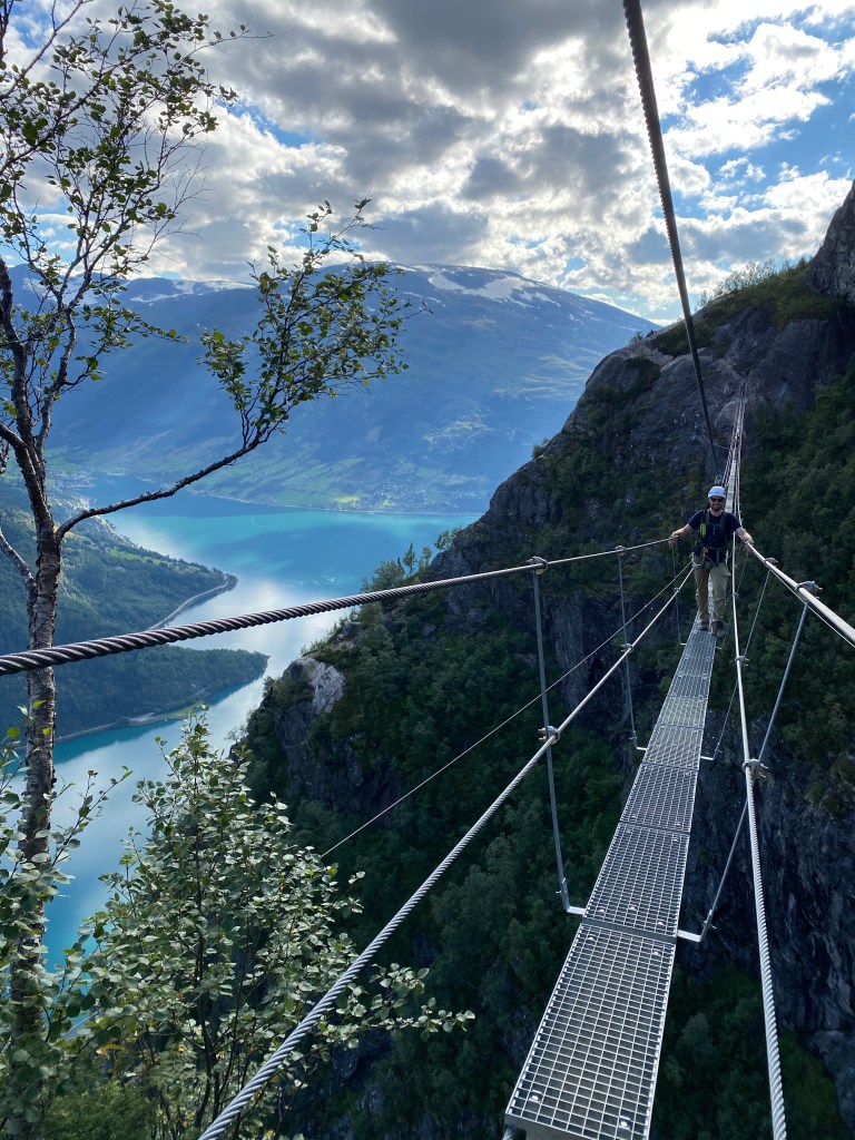 Angefixt von dem letzten Klettersteig haben wir uns direkt noch einen in Loen rausgesucht. Die „Via Ferrata Loen“. Doppelt so lang, hoch und aufregend. Hier mussten wir einen Slot bei der örtlichen Touristeninfo buchen. Wir haben für den Steig und die Abfahrt insgesamt 410 NOK bezahlt, also ca. 35 EUR. Dafür haben wir uns einen langen Abstieg und eine Busfahrt zurück gespart. Die sechs Stunden schweißtreibende Spannung haben sich gelohnt. Bei jedem Schritt am und auf dem Felsen wurden wir von herrlichstem Wetter und atemberaubender Aussicht begleitet. Ein Teil der Route führte uns über eine schmale Hängebrücke (längste Klettersteigbrücke Europas), die ich (Jana) noch tapfer mitgemacht habe. Für ganz mutige gab es noch eine weitere Herausforderung in Form eines gespannten Stahlseils über einer Schlucht. Das durfte Christian dann doch lieber allein machen. Ich bin herumgelaufen und habe von oben voller Spannung zugesehen. An unserem Schlafplatz, ein Parkplatz mit Toilette am Loelva haben wir dann noch eine Wanderung zum Kjenndal Gletscher gemacht.