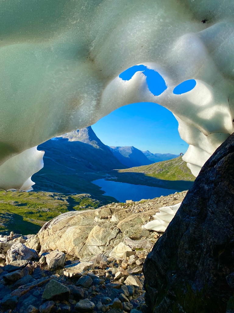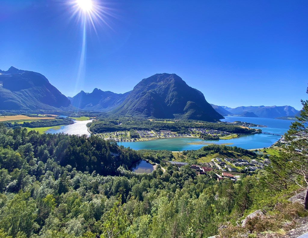 Der Trollstiegen ist definitiv ein Hingucker, dadurch leider auch sehr überlaufen. Fast minütlich kam ein Bus mit Touristen an, da geht die Ruhe Norwegens schnell verloren. Später haben wir eine schmale, alte Poststraße gefunden und befahren, diese war für uns deutlich schöner und wieder menschenleer. Unser nächstes Ziel war der Klettersteig „Via Ferrara Romsdalsstigen (Introwall)“. So blieben wir auf dem Andalsnes Campingplatz. Der Steig ist kostenlos, also packten wir unser Klettersteigset und machten uns auf. Der Stieg ist Genuss pur. Es gibt die eine oder andere kribbelige Stelle, ist aber auch für Anfänger ohne Höhenangst machbar. Nach ca. 2,5 h hatten wir den Gipfel erreicht und sind entspannt abgewandert.