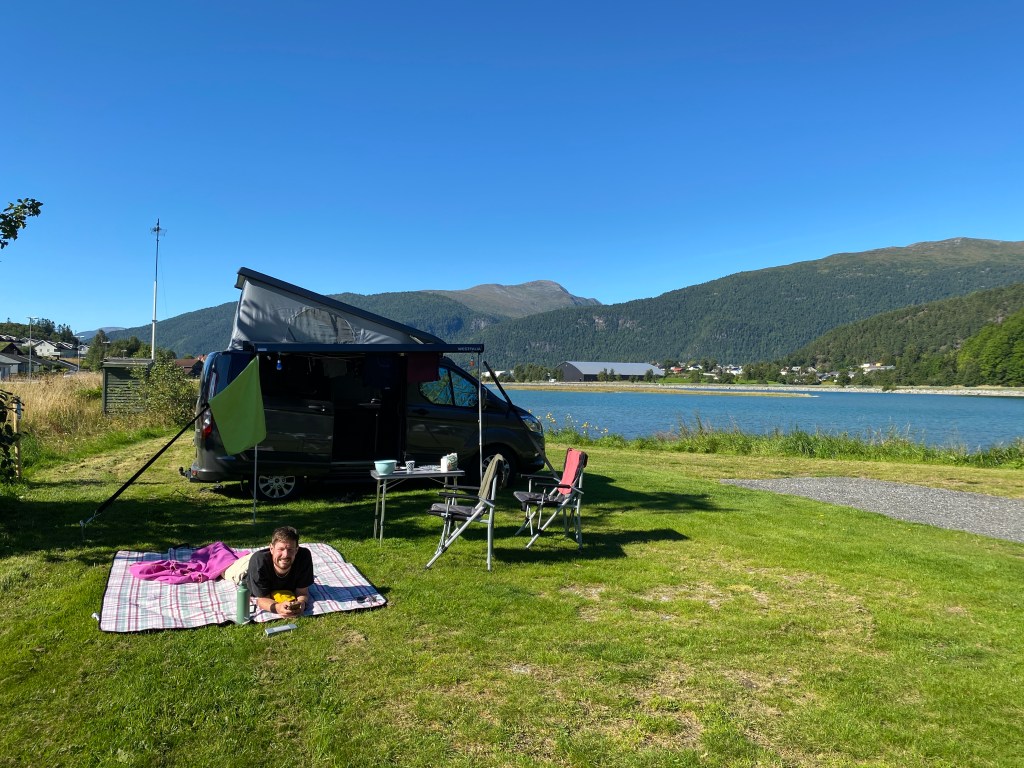 Wir haben uns entschieden, weiter entlang der zerklüfteten Küsten Richtung Norden zu fahren. Da nicht überall Brücken gebaut wurden, gibt es zwischendurch immer wieder Fähren, um die Fjorde zu überqueren. Um entspannter unterwegs zu sein, haben wir uns zuvor auf der Plattform Epass24 angemeldet und unser Kennzeichen des Mietwagens hinterlegt. So können wir entspannt auf allen Fähren und Mautstraßen in Norwegen fahren und die Gebühren werden automatisch abgebucht. Eine Fährfahrt kostet zwischen 9 – 11 Euro (105 – 128 NOK). Nach einem kurzen Halt in Vadheim und einen cremigen Kaffee im Madelena Kafe haben wir uns einen Schlafplatz für die Nacht gesucht und fanden einen wunderschönen Platz direkt am Storelva-Fluss (Storebru) auf dem Endestad Campingplatz. Weil es uns so gut gefallen hat, blieben wir zwei Nächte und haben zwei lustige Regenwanderungen durch die Hochmoore gemacht.