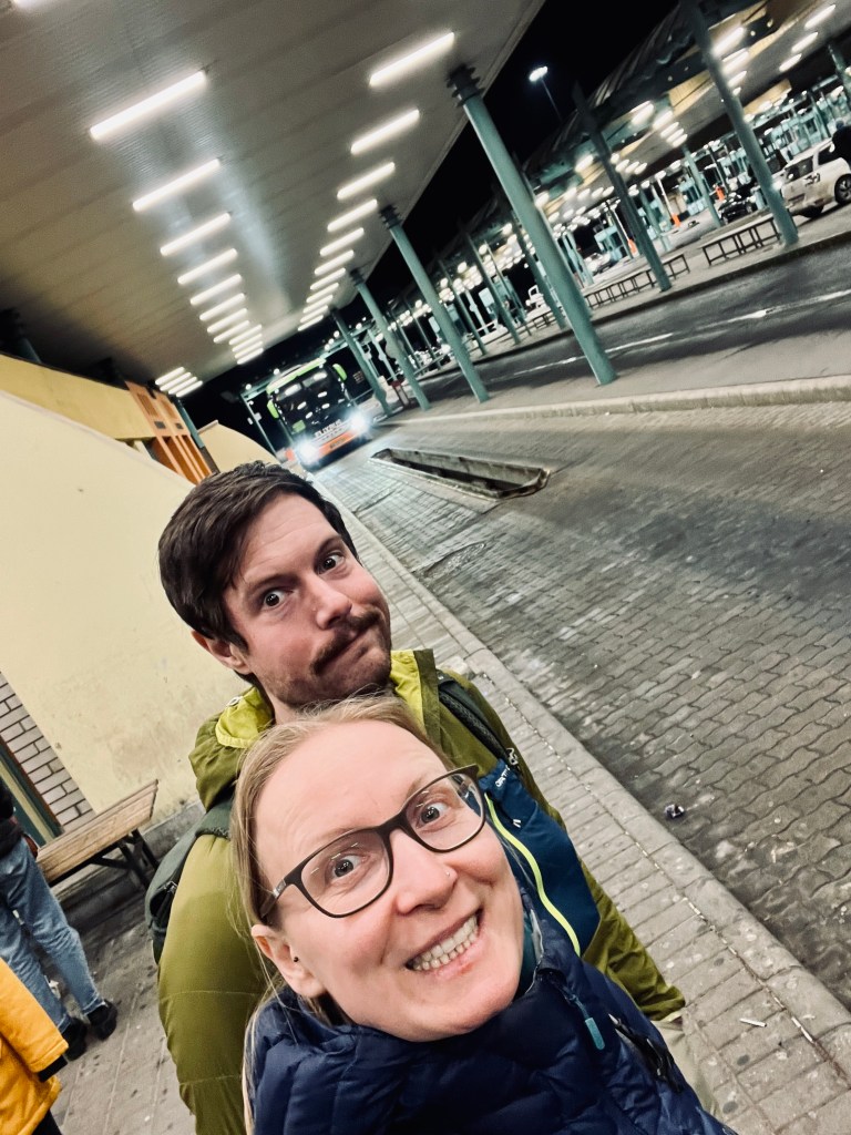 Am Busbahnhof angekommen checken wir kurz die Lage, übersichtlich und noch massig Zeit. Da der Bahnhof keine Cafés oder Bistros mit Sitzplätzen bietet, entscheiden wir uns noch ein Stück zu laufen und landen in einem Café am Fußballstadion. Hier können wir immerhin bis 15:00 Uhr im Warmen sitzen und den Tagebuchbeitrag der letzten Woche schreiben. Die letzte Stunde vor Abfahrt verbringen wir im Wartebereich des Busbahnhofes, nur durch Zufall entdecken wir, sieben Minuten vor Abfahrt, unseren Bus. Die Flix-Busse werden hier leider nicht angeschrieben – Glück gehabt.