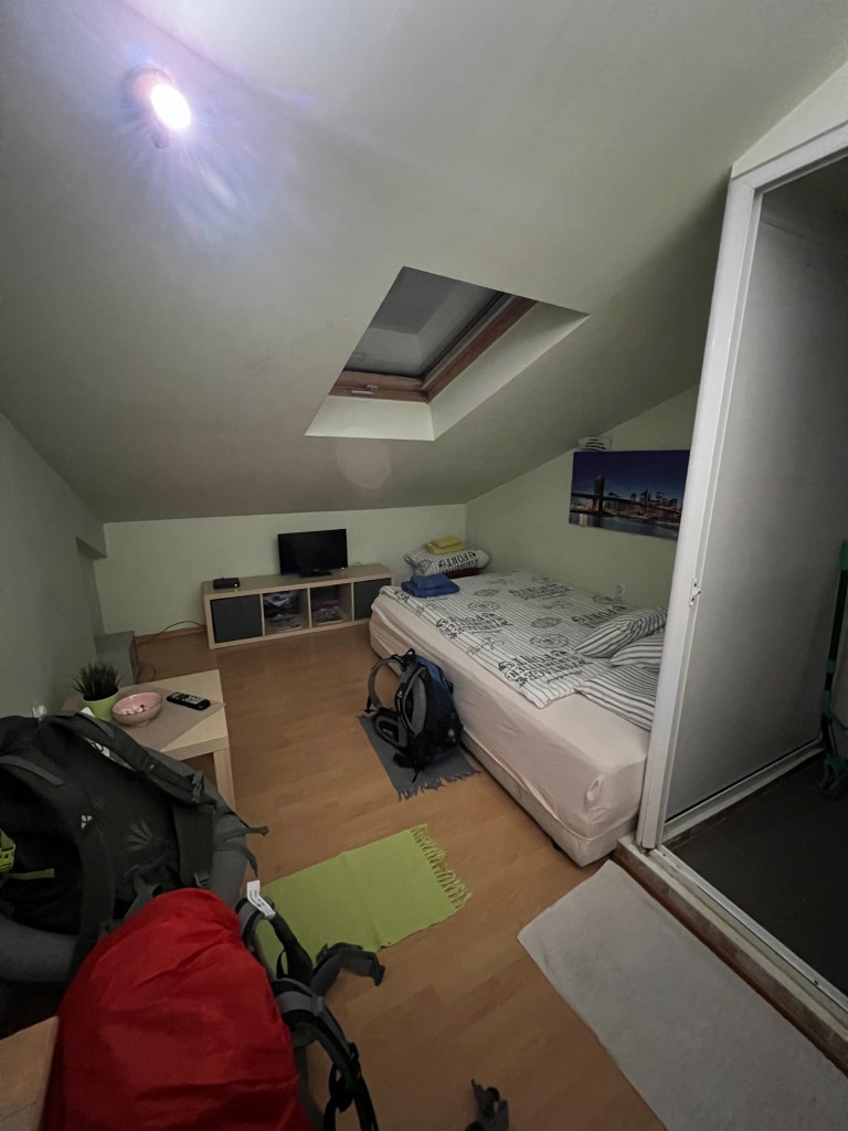 Das Zimmer ist günstig, zurecht 😀 Für 30 € die Nacht haben wir 4x4m, zur Hälfte mit Dachschräge. Das WC ist in die Dusche integriert oder die Dusche ins WC; wie man es sehen möchte. Ohne laufende Klimaanlage sinkt die Temperatur innerhalb von Minuten auf Außentemperatur und es stinkt nach Klostein, Jackpot.