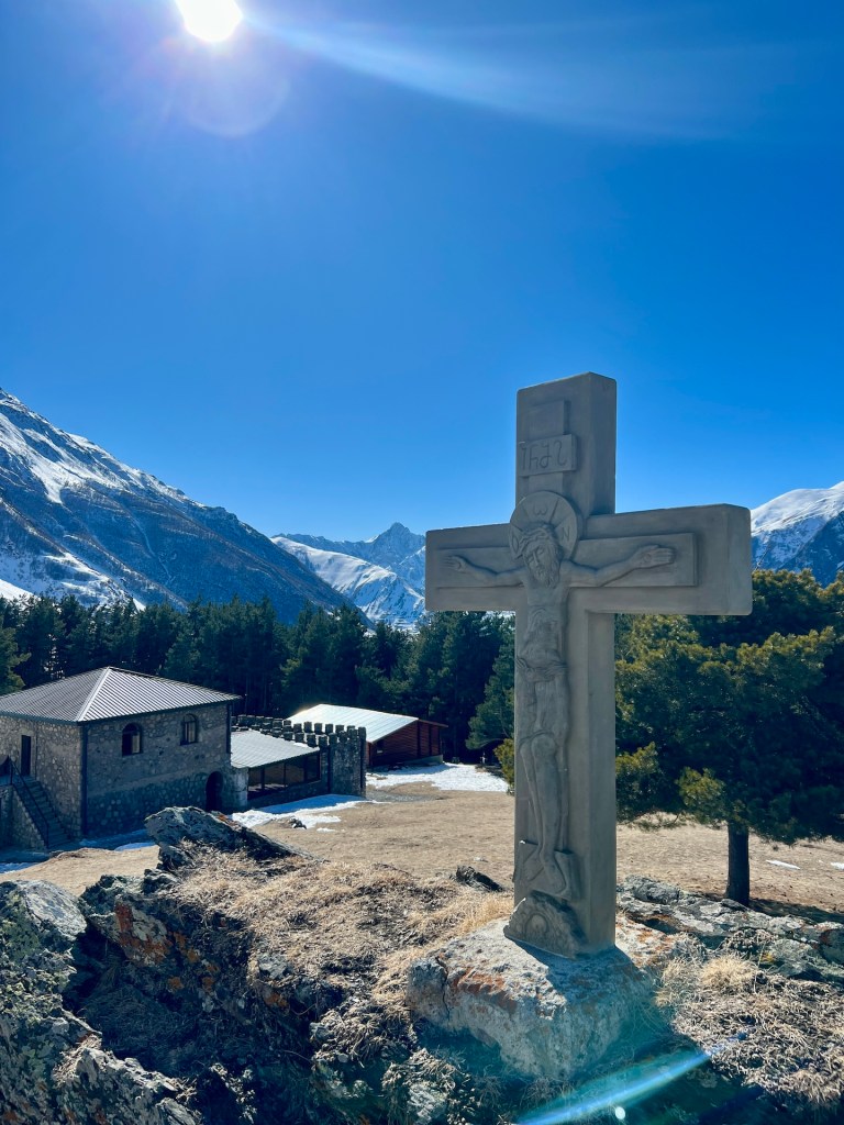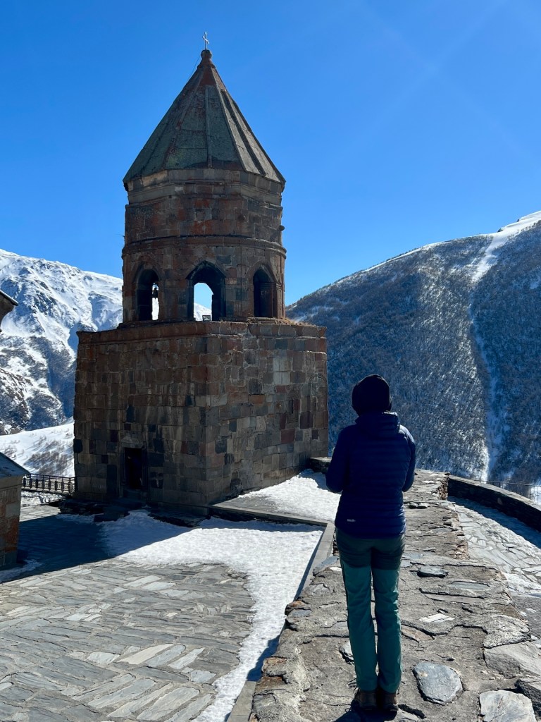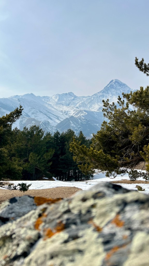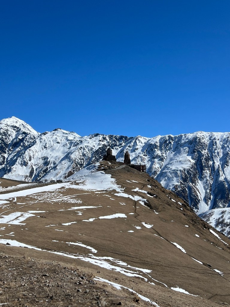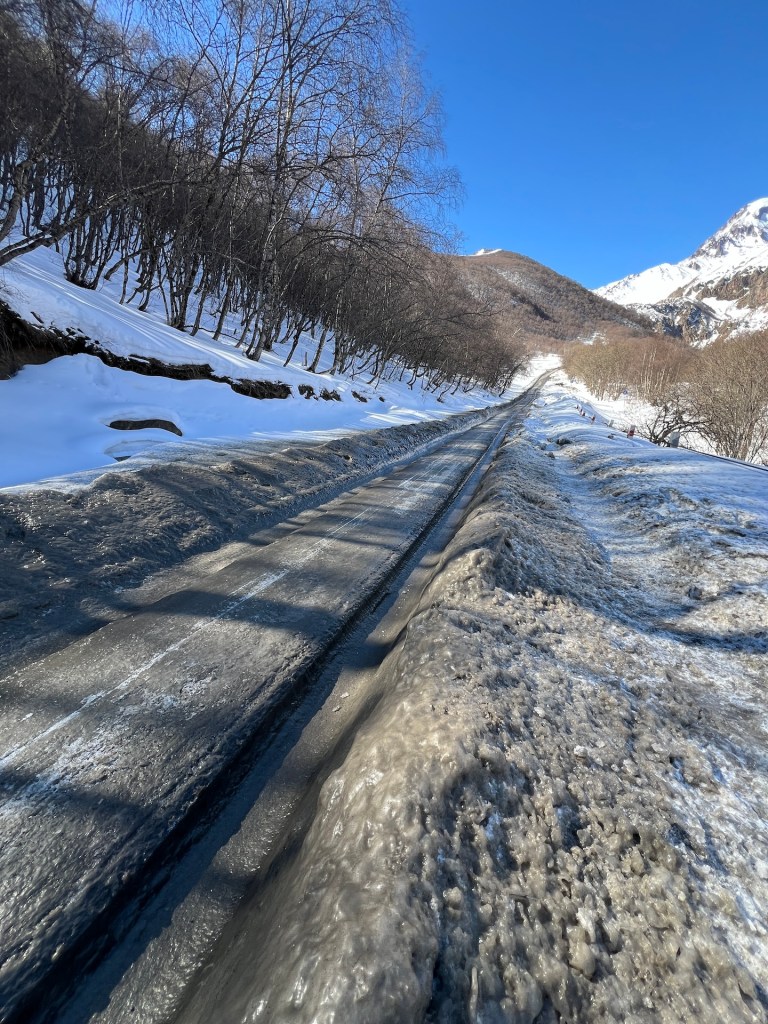 Die Kapelle, der Glockenturm und die Wohngebäude der Priester liegen oberhalb eines kleinen Tannenwäldchens. Im Rücken den Berg Elias und mit Blick auf den Berg Kazbek können wir von hier über ganz Kazbegi blicken. Außerdem können wir den ersten Blick auf das Wanderziel für morgen werfen; der Gergetier Dreifaltigkeitskirche. Sieht von hier gar nicht so hoch aus 😏 Als wir die Bilder und Atmosphäre völlig in uns aufgesogen haben, verlassen wir das Gelände und machen uns weiter in Richtung Wasserfall auf. Mittlerweile umgeben uns Schnee, Eis und eine unbestimmte Mischung aus beidem. Es taut hier oben bereits. Wir erklimmen noch einige Höhenmeter bis wir vor einem Tal zwischen den Bergen stehen. Hier soll sich der Wasserfall verstecken. Wir können maximal erahnen wo er normalerweise aus dem Berg stößt. Außerdem müssen wir feststellen, dass Wanderwege hier aktuell entweder nicht existieren oder wir sie wegen dem Schnee nicht sehen können. Jedenfalls ist sicheres weiterwandern mit unserer Ausrüstung hier nicht möglich. Wir entscheiden uns nach einer kleinen Fotosession den Rückweg anzutreten.