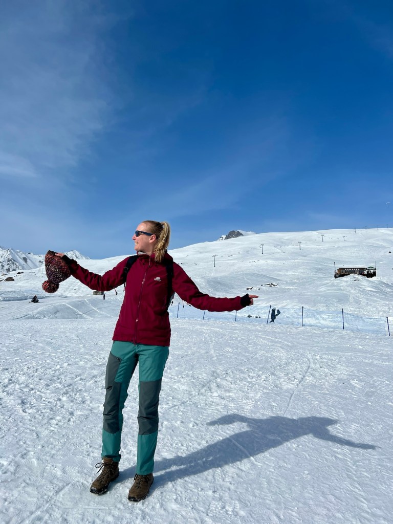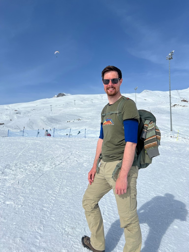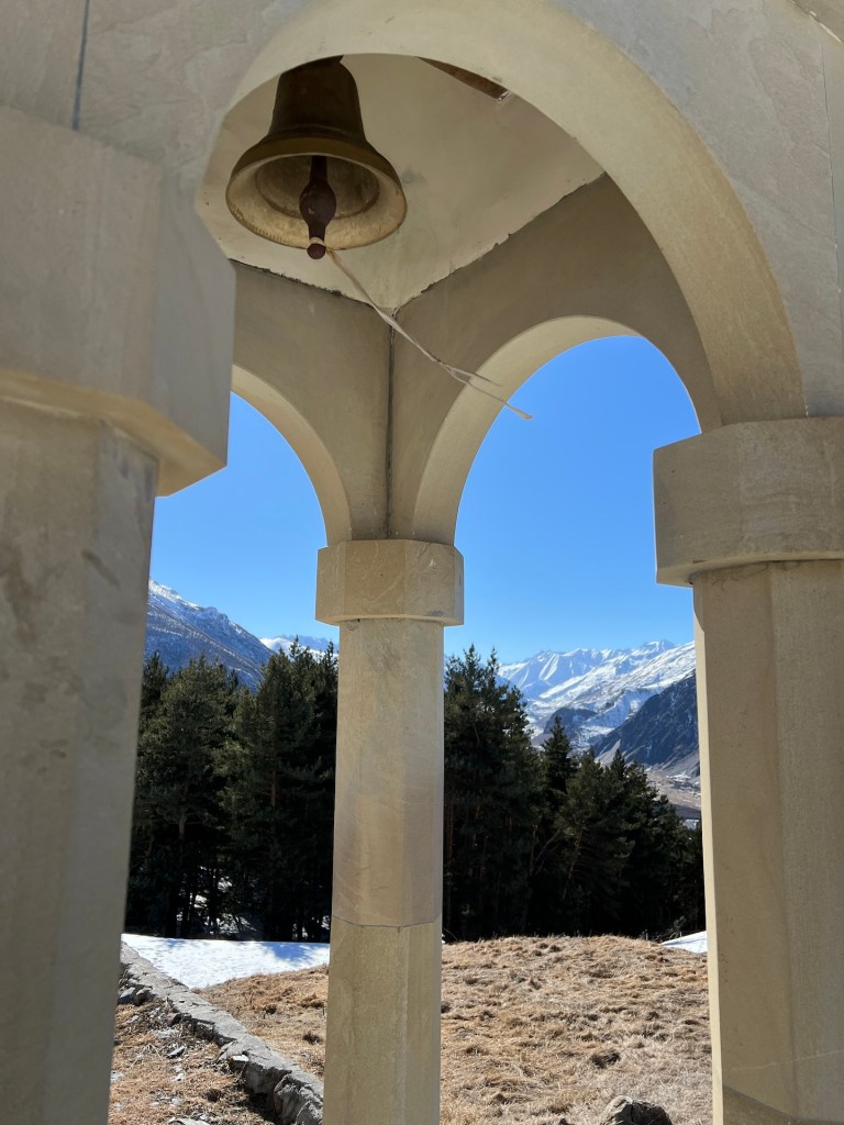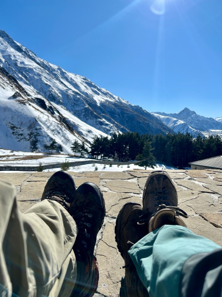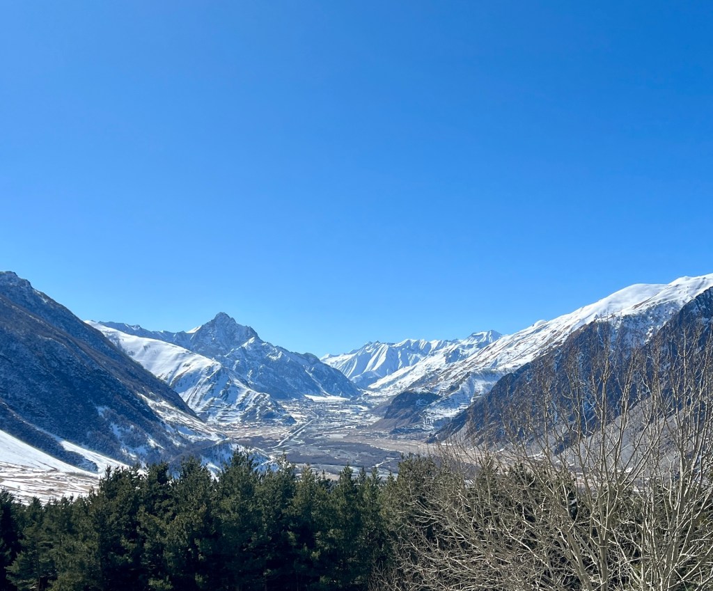 Die Kapelle, der Glockenturm und die Wohngebäude der Priester liegen oberhalb eines kleinen Tannenwäldchens. Im Rücken den Berg Elias und mit Blick auf den Berg Kazbek können wir von hier über ganz Kazbegi blicken. Außerdem können wir den ersten Blick auf das Wanderziel für morgen werfen; der Gergetier Dreifaltigkeitskirche. Sieht von hier gar nicht so hoch aus 😏 Als wir die Bilder und Atmosphäre völlig in uns aufgesogen haben, verlassen wir das Gelände und machen uns weiter in Richtung Wasserfall auf. Mittlerweile umgeben uns Schnee, Eis und eine unbestimmte Mischung aus beidem. Es taut hier oben bereits. Wir erklimmen noch einige Höhenmeter bis wir vor einem Tal zwischen den Bergen stehen. Hier soll sich der Wasserfall verstecken. Wir können maximal erahnen wo er normalerweise aus dem Berg stößt. Außerdem müssen wir feststellen, dass Wanderwege hier aktuell entweder nicht existieren oder wir sie wegen dem Schnee nicht sehen können. Jedenfalls ist sicheres weiterwandern mit unserer Ausrüstung hier nicht möglich. Wir entscheiden uns nach einer kleinen Fotosession den Rückweg anzutreten.