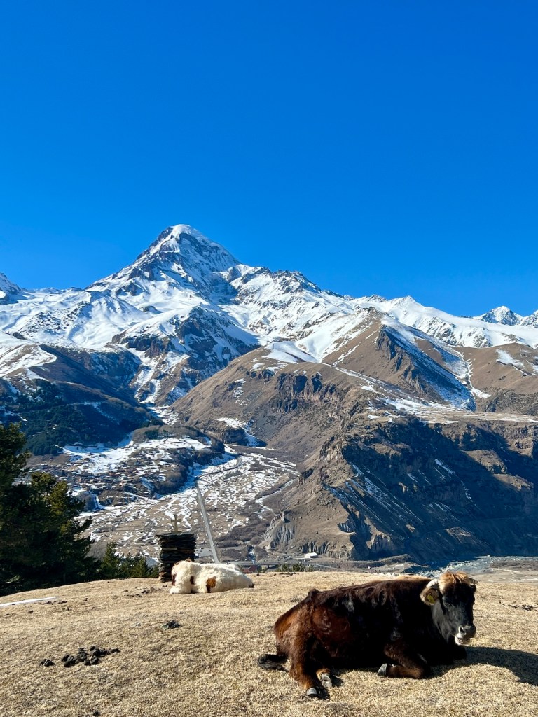 Den Weg durch Kazbegi kennen wir mittlerweile sehr gut. Wir gehen zielstrebig durch den Ort zu einer Brücke die Stepanzminda mit dem „Ortsteil“ Gergeti verbindet. Der Terek, ein 623km langer Quellfluss, trennt die beiden Orte. Auf etwa 3200m wird der Fluss von einem Gletscher gespeist und mündet unter dem Meeresspiegel im Kaspischen Meer. Wir überqueren die Brücke und passieren Gergeti. Zunächst folgen wir einer Straße die zur Dreifaltigkeitskirche führt, biegen dann aber auf den Wanderweg ab. Dieser führt über schmale Gassen und Hinterhöfe durch den Ort. Nach und nach wird der Weg schlechter bis wir uns letztlich auf einem Kuhhighway befinden. Hier werden die Kühe zu ihren Weideflächen getrieben – entsprechend laufen wir im Slalom um ihre Häufchen. Noch einmal die Hauptstraße queren und wir befinden uns im Winterwonderland.