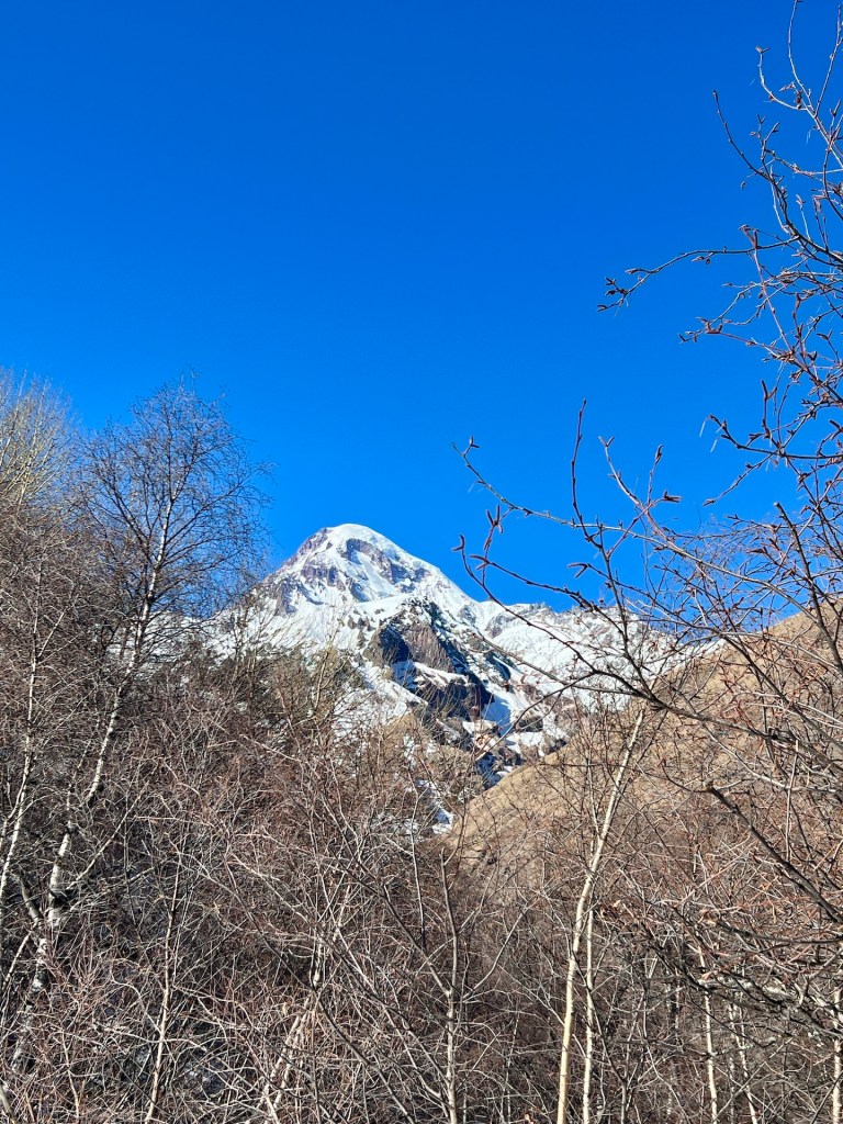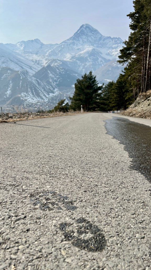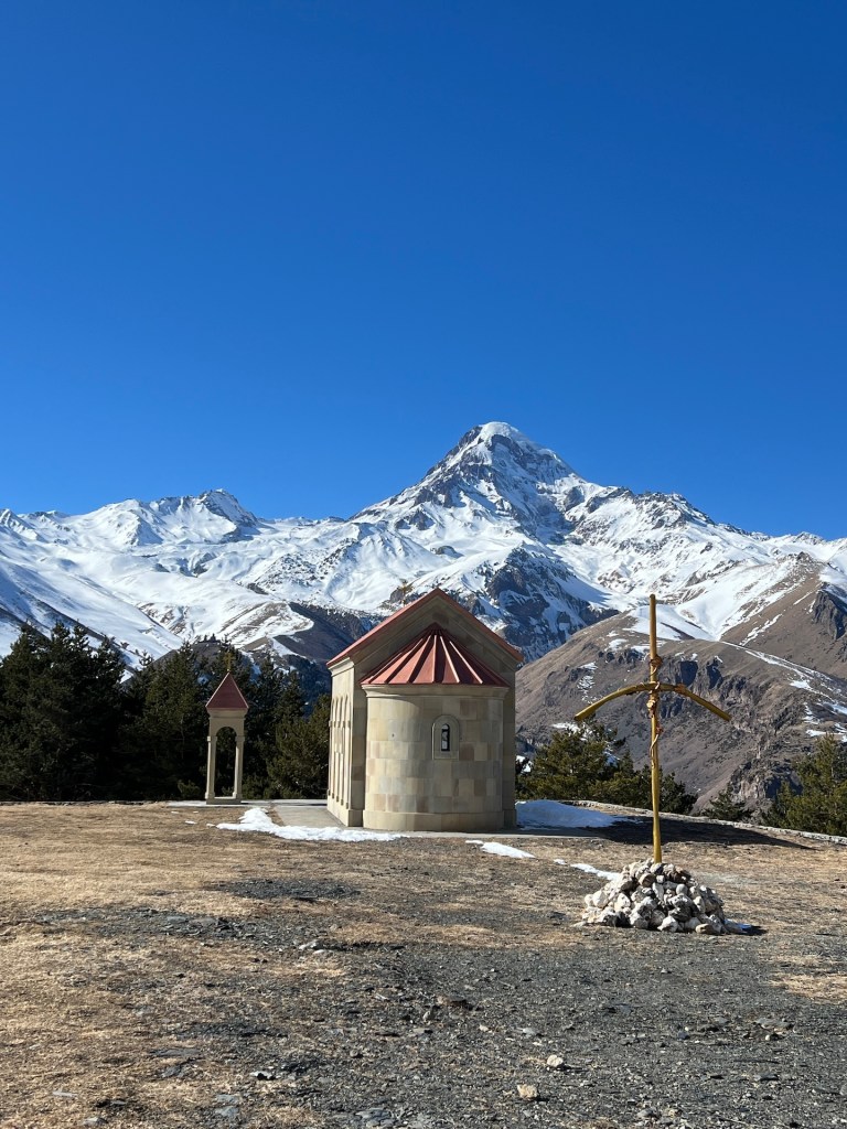 Der etwa 2,5km lange Wanderweg ist nahezu unberührt. Wir entdecken einige Fußspuren, hier und da ist der Weg gut eingetreten. Nach einigen Metern kommen wir an einer notdürftig aufgebauten Kapelle vorbei. Die St. Georg Church. Dem Weg weiter folgend haben wir perfekte Sicht auf den Kasbek. Der Berg hat mit seinen 5047m eine magische Anziehungskraft auf uns.