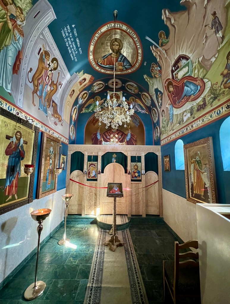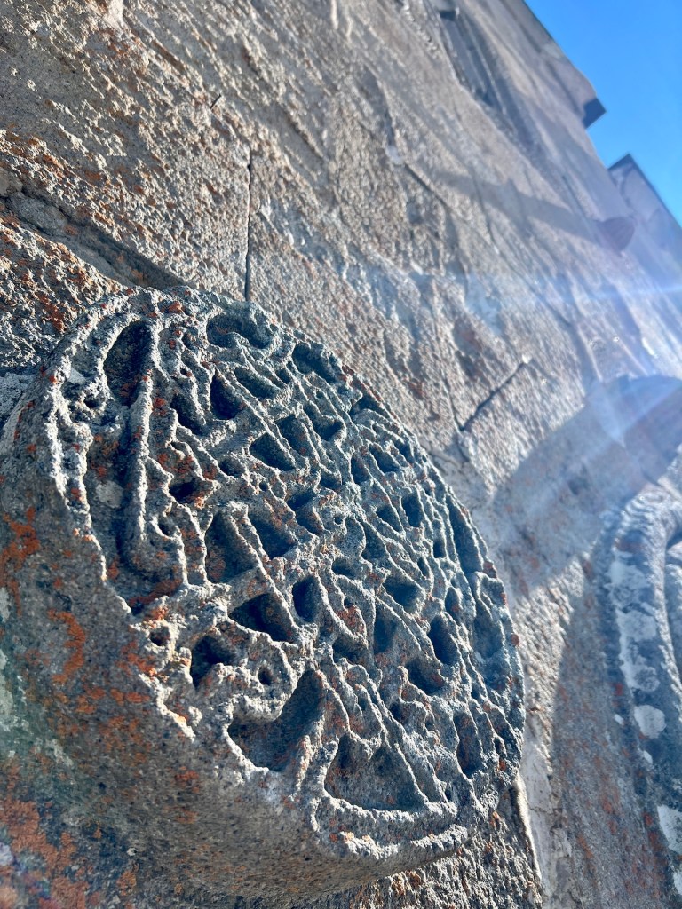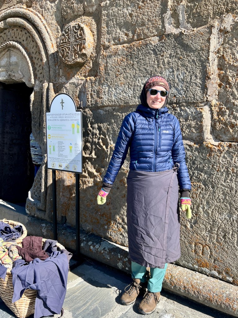 Zeit für etwas Sightseeing. Die Kuppelkirche und der Glockenturm werden auf das 14.Jahrhundert datiert. An den Außenwänden und in der Kirche finden sich zahlreiche georgische Ornamente. Um die Kirche zu betreten muss sich Jana einen Rock über die Hose binden – ungewohnt, findet ihr nicht?