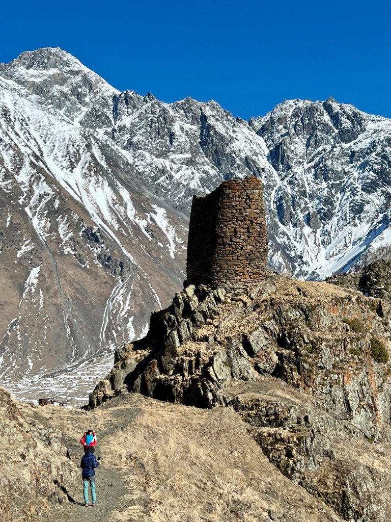 Unser Abstieg verläuft nahezu Schnee- und Eisfrei. Richtige Entscheidung. Auch sonst haben wir während des Rückweges bis auf Jana’s „Erdbeertagestimmung“ (Meistens nur ein Tag zuvor, aber da ist einfach alles und jeder Scheiße) keine Herausforderungen. Wir kommen noch am Gergeti Tower vorbei, eine Ruine der im 16. – 17.Jahrhundert aus Schiefer gebauten Befestigungsanlage.