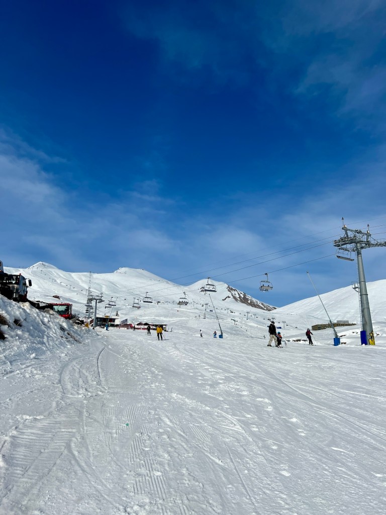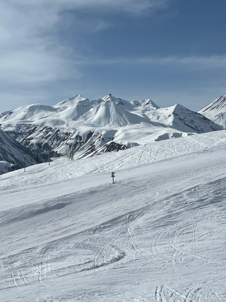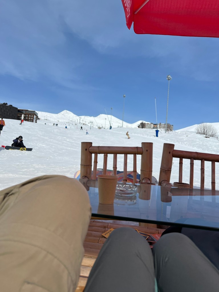 Jetzt kriegt anscheinend auch Christian Hunger. Der Schnee nervt ihn, mit jedem Schritt sinkt er bis zu den Knien ein. Gut möglich, dass wir ein bisschen vom Weg abgekommen sind. Mit letzter Kraft (haha) erreichen wir unseren Zwischenstopp. Ein DJ legt auf, gekocht wird auf einem Smoker und die Terrasse liegt in der Sonne. Perfekt. Wir bestellen Pommes, Imeretian Khachapuri und Getränke. Wir feiern uns für das Stück das wir bereits den Berg erklommen sind. Es ist etwa 16:00Uhr als wir uns entscheiden unseren Weg fortzusetzen. Fehlanzeige, das Essen liegt so schwer im Magen, dass jeder weitere Schritt eine Zumutung ist. Naja, wir sind auf unsere Berg- und Schneekosten gekommen und entscheiden uns den Rückweg anzutreten.