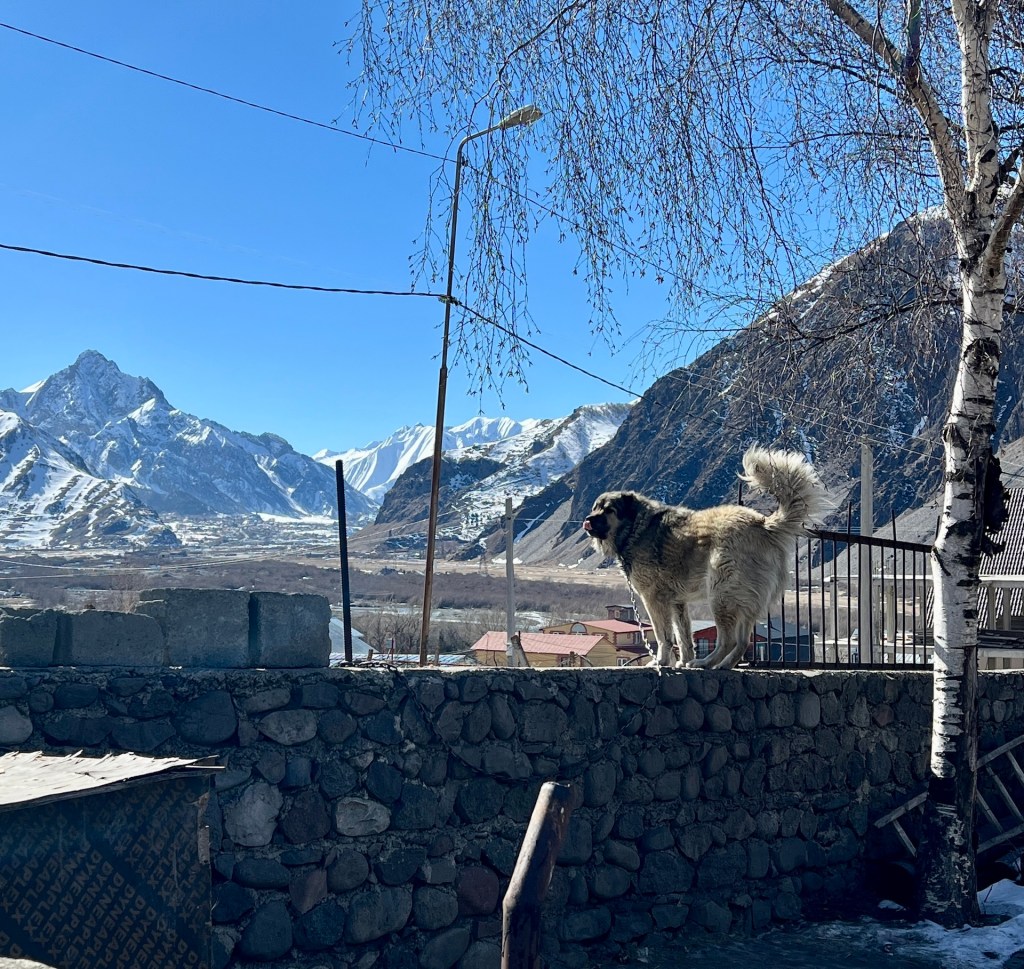 Nachdem wir gestern wie durch ein Wunder an einem Stück in Kazbegi angekommen sind, lassen wir die Woche gaaaaanz entspannt starten. Nach einem ausgiebigen Frühstück bummeln wir durch die Stadt. Mit etwa 1326 Einwohnern (Stand 2014) kann man nicht wirklich von einer Stadt sprechen. Dennoch gibt es einige Möglichkeiten für Einkäufe. Wie schon das ein oder andere mal auf unserer Reise sind wir außerhalb der Saison hier. Es reihen sich Ferienhäuser an Hotels und Gasthäusern. Zur Saison könnten hier gefühlt doppelt so viele Touristen wie Einwohner wohnen.