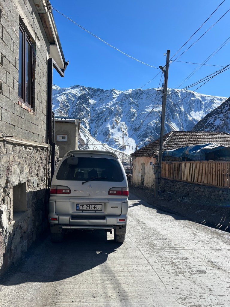 Gegen halb sechs müsste der nächste Bus nach Hause fahren, den kriegen wir. Den Weg ins Tal schlittern wir mehr oder weniger an einem Stück den Berg hinab. Jana legt noch kurz eine Toilettenpause ein, als um 20 nach 5 der Bus an Christian vorbei rauscht. Pech. Zwei Möglichkeiten; 1. eine Stunde auf den nächsten warten, 2. TRAMPEN! Na klar, wir befinden uns in dem Tramper freundlichsten Land überhaupt, dass machen wir. Etwas zögerlich streckt Jana also jedem Fahrzeug ohne Taxi-Schild den Daumen entgegen. Zack keine fünf Minuten später hält jemand an; leider nicht unsere Richtung. Nagut, weiter versuchen. Wieder stoppt ein Auto, diesmal ein Mitsubishi Delica, gefühlt kommen die alle aus Kasbegi. Als wir fragen ob der Fahrer nach Kasbegi fährt nickt dieser und verlangt 100GEL (zur Erinnerung, für den Preis hat uns Racing Daniel aus Tiflis nach Kasbegi gefahren). Wir sind etwas verdutzt und lehnen dankend ab. An dem Auto steht nicht mal Taxi, so wollten wir nicht trampen. Anstatt wegzufahren fängt der Fahrer an zu verhandeln. Als wir ihm sagen, wir seien für 15GEL p.P. hier hergekommen ist sein letztes Angebot 20GEL p.P. Wir überlegen kurz und sind dann doch bereit die 14€ für die Fahrt zu bezahlen. Wir haben es immerhin versucht und es wird schon nicht die letzte Möglichkeit sein 😄