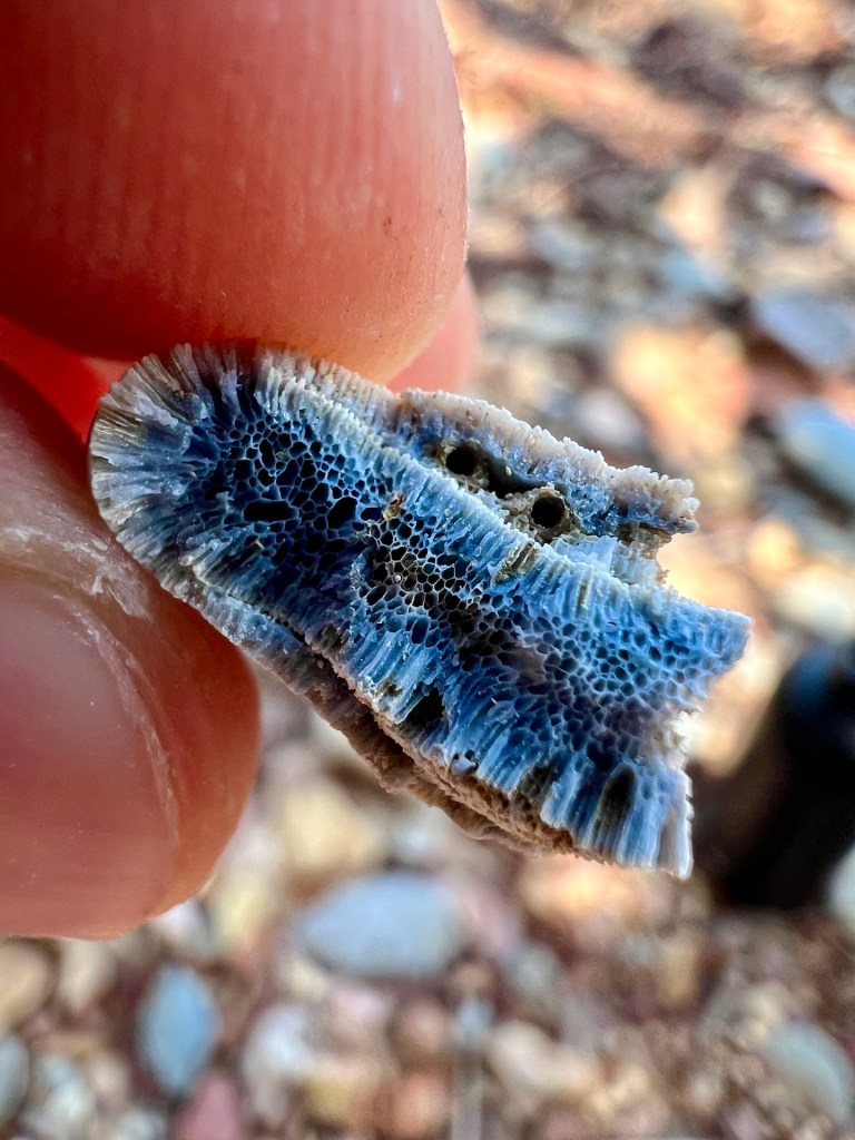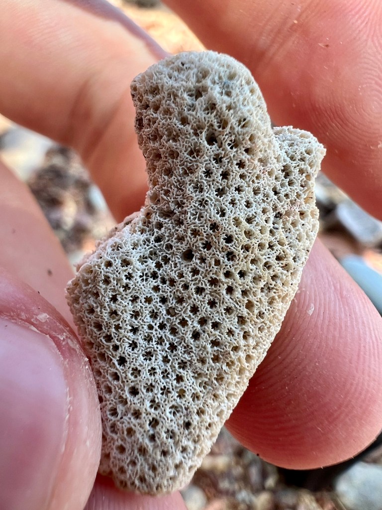 Wir schwingen uns auf den Scooter, die Tankanzeige zeigt: Fast Leer. So war das nicht vereinbart. Gut das wir nur ein paar Hügel hinter uns lassen müssen und zwischendurch rollen lassen können. Der Pirate Beach ist ganz schön, allerdings nicht so spektakulär wie erwartet. Vielleicht sind wir auch schon Strand gesättigt. Wir wissen es nicht. Im Schatten der Bäume genießen wir die Wellen und die Aussicht. Wie an allen Stränden hier, ist der Sand angereichert mit Korallenbruch. Wir entdecken drei verschiedenen weiße Korallenskelette. Mit sternförmigen Löchern, langgezogenen Riffeln und punktförmigen Ausläufern. Natürlich zerbrechen wir auch eines, um zu sehen, wie es im Inneren ausschaut. Seht selbst: