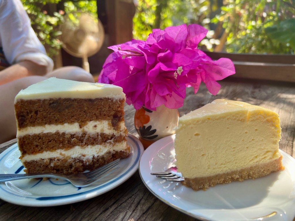 Den Kuchen genehmigen wir uns trotzdem (Seht ihr, es ist wieder passiert!) Nachdem wir die Einfahrt einmal verpasst haben, finden wir die unscheinbare Straße zum Café. Das Café ist ein Garten mit kleinem Wohnhaus und Gartenhütte, die im Gegensatz zum Wohnhaus wesentlich größer ist. Wir werden herzlich begrüßt. Da im Gartenhäuschen gekifft wird und weil der Garten schön ist, bleiben wir draußen sitzen. Wir bekommen eine Kanne Tee zur Begrüßung und die, die wir bestellt haben, leckeren Frappo Latte und das Highlight: Karottenkuchen und Lemon-Cheesecake 🤤 Findet ihr nicht auch, dass das Wort „Lecker“ schon im Namen steht? Begleitet durch 1969er Woodstock-Musik genießen wir jeden Bissen.