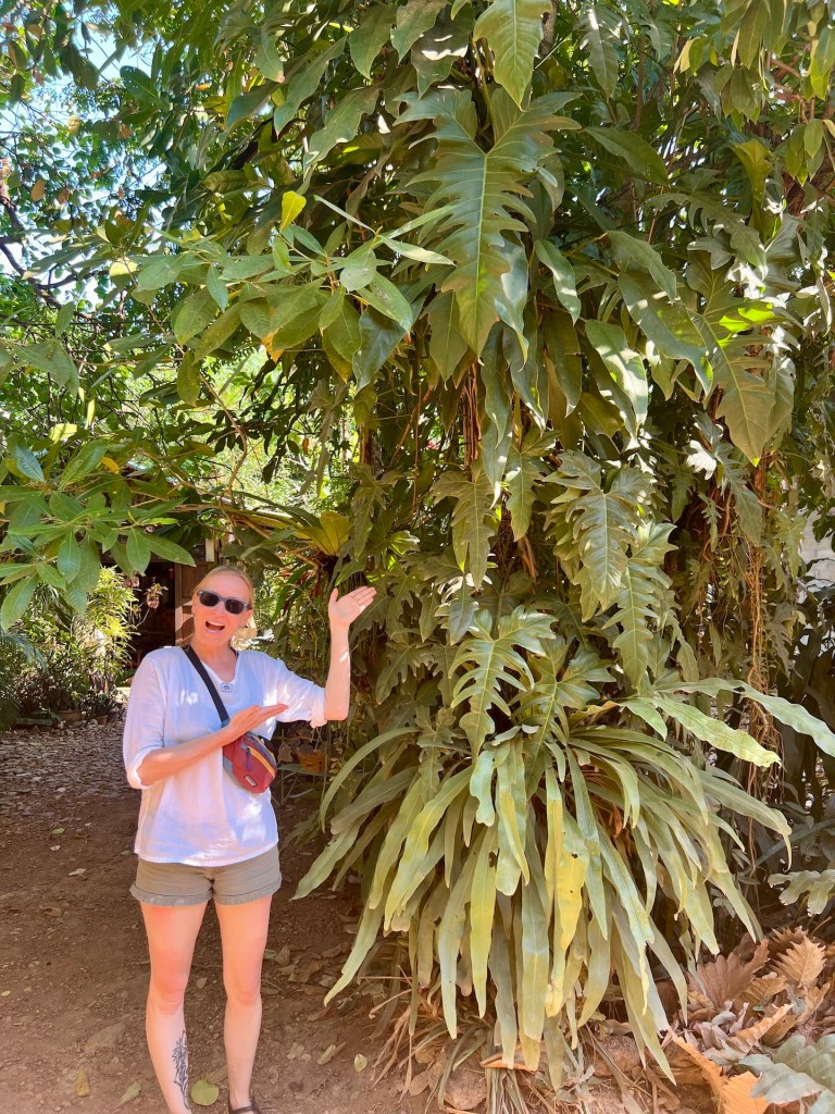 Die Straße endet in einem Grundstück, wo sich u. a. ein Restaurant befindet. Zu unserer Überraschung auch ein kleiner Pfad in den Dschungel, in dem sich ein 1000 Jahre alter Baum befindet. Ein Schild weist uns den Weg und erklärt, dass wir gern eine kleine Spende für „Education (Ausbildung)“ geben dürfen. Für Ausbildung lassen wir gern etwas da. Schilder wie: „Protect the World`s environment“ und „Now, you are going to the rainforest“, zeigen wo es lang geht. Doch auch ohne, hätten wir es gefühlt und gesehen. Die Blätter der Pflanzen werden menschengroß, die Natur wird lauter und überall bewegt sich etwas. Zudem fangen wir umgehend an, aus allen Poren unserer Körper zu triefen. Wir fühlen, sehen und riechen den Dschungel. Ein Weg aus Steinen und Wurzelwerk führt uns direkt zu unserem Ziel.