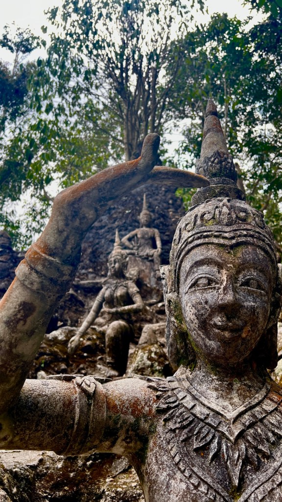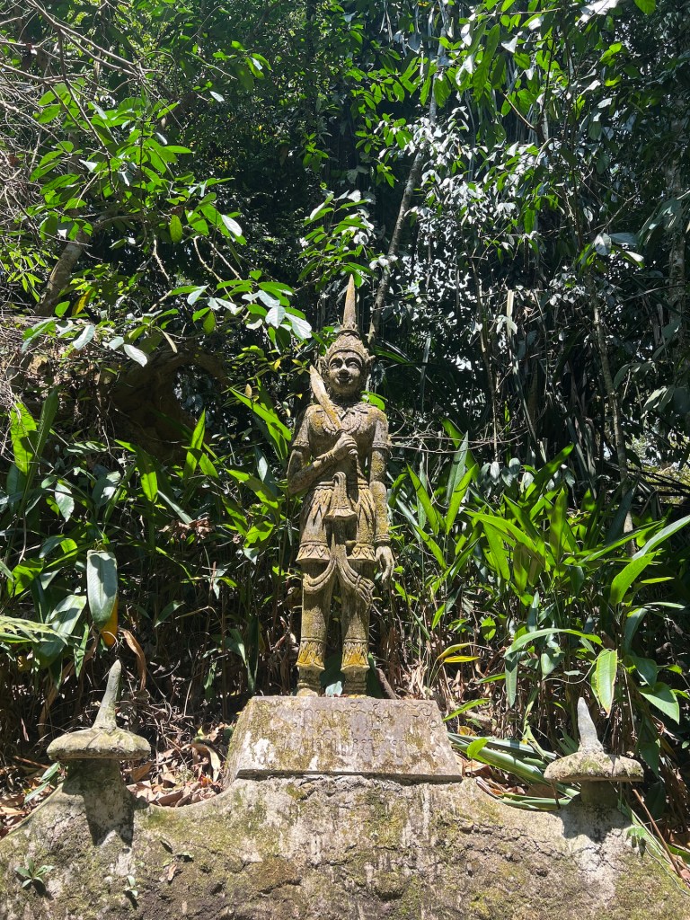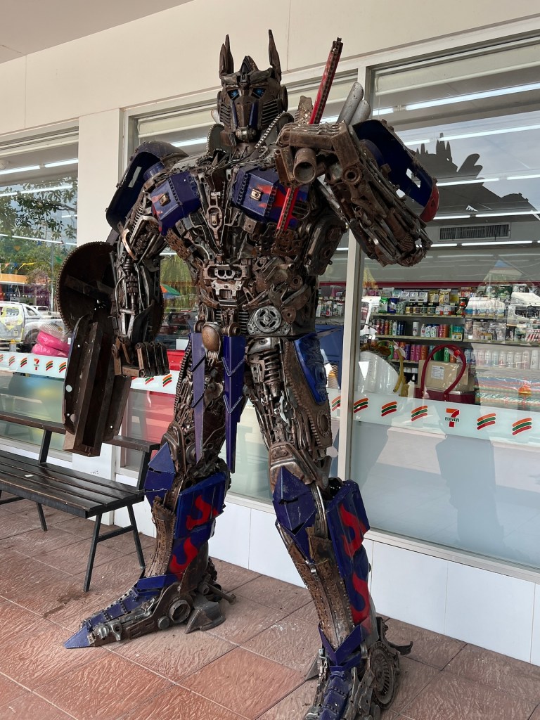 Ausreichend Pause gibt es alle Male. Entweder, weil der Fahrer seine Kinder an einer Bushaltestelle absetzt oder bei einer Mopedwerkstatt was zu klären hat. Aber auch, für Pinkel- und Snackpausen. Wir gönnen uns Eis. Auf unserer Reise durch Thailand haben wir schon oft gesehen, dass überall große oder kleine Kunst-Figuren aus Metallschrott stehen. Von Alien bis Batman ist alles dabei. Einer der Rastplätze treibt es an die Spitze. Wir sehen locker 10 große Figuren.