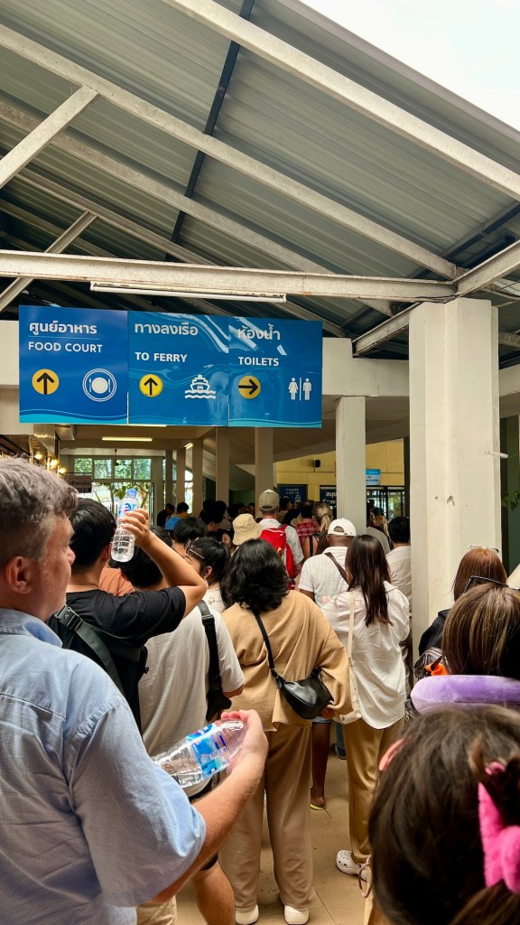 Nach ca. 8,5 h kommen wir am Ambphoe Don Sak Pier und dem Golf von Thailand an. Wir sind gespannt wie es weitergeht. Obwohl wir bisher keine schlechten Erfahrungen mit Inlandsreisen gemacht haben, sind wir immer noch skeptisch. Eine Frau steigt in den Bus und überreicht uns Tickets für die Fähre und den Hoteltransfer auf Koh Samui. Dann ist sie wieder weg. Alles klar, ab zur Fähre. Sie fährt sofort und wir kommen direkt mit. Alles nach Plan.