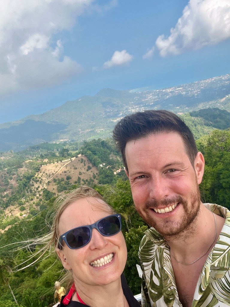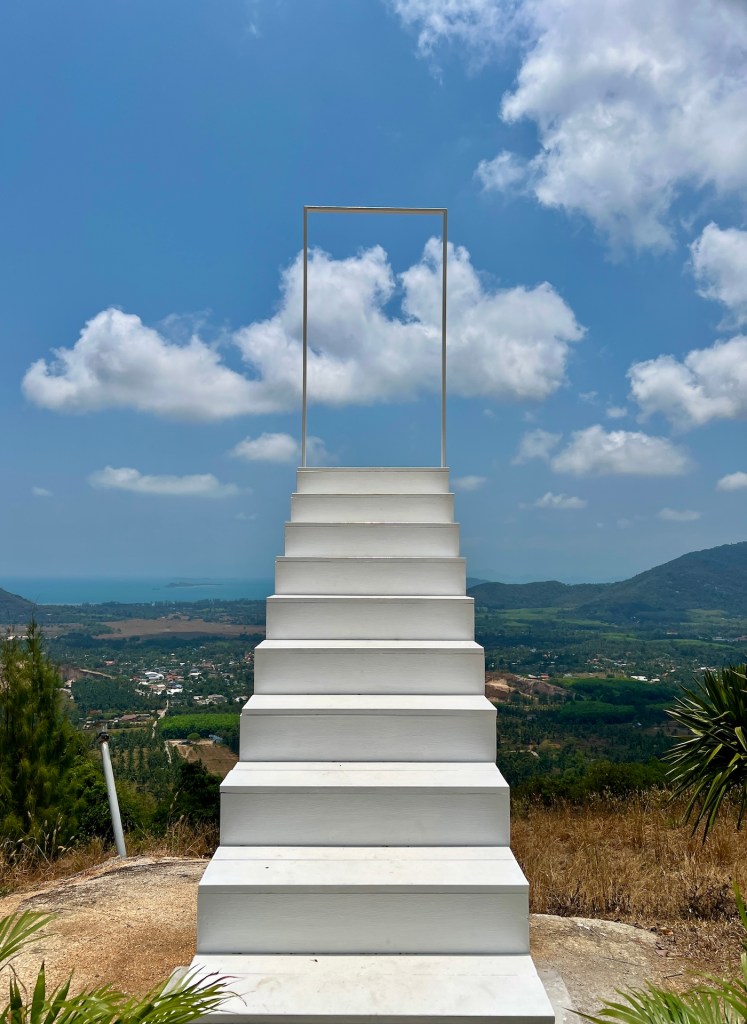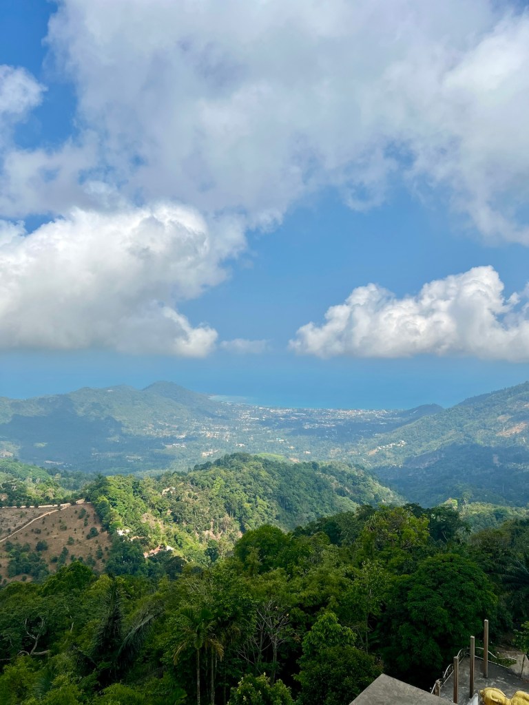 Unser letztes Ziel für heute ist der Pra Buddha Dipankara. Eine Aussichtsplattform, auf einen der höchsten Punkte Samuis. Christian hat bereits gelesen, dass der Weg dahin abenteuerlich zu fahren ist. Empfohlen wird Quad oder ein 4×4 Jeep. Alle anderen sollten erfahrene Biker sein. Wir haben ja zum Glück einen. Die bisher aus Beton gegossene Straße wird schlagartig zu einer Cross-Piste. Sand, Geröll, tiefe Rinnen und hohe Hügel. Das erfordert Konzentration, Geschick, ein wenig Wahnsinn und eine Sozia, die alles mit Freude mitmacht. Ham wa und packen wa. Wir kommen heil oben an und Jana zieht ihren imaginären Hut vor Christians Fahrkünsten.