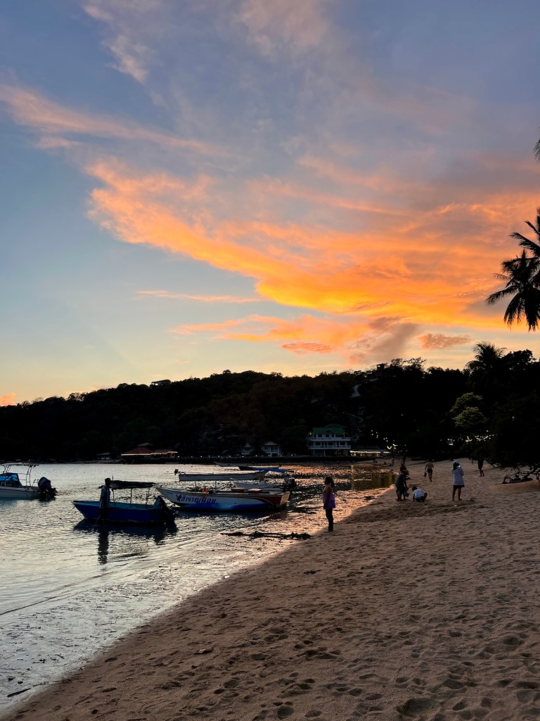 Hats wer geglaubt? Wir brauchen noch ein Piercing für Jana, da sie ihren beim Toben im Pool verloren hat. Es ist nicht leicht auf den Inseln hier Piercer zu finden. Weder auf Samui noch auf Tao. Doch der zehnte Anlauf hat Erfolg und der Tragus ist geschmückt. Das nächste Ziel heißt House of Pad Thai. Eines der Lieblingsgerichte aller Touristen in Thailand. Lecker. Unser nächster Spot ist die Ao Hin Wong Bay. Der Strand und die Bar erinnern an ein Hippi-Aussteiger-Camp. Guitarklänge von Bob Marley mit dem sanften Duft von Cannabis. Stände mit Kunst, Schmuck und selbst geschröpften Papiertagebüchern in Leder eingebunden. Dieser Strand ist der erste auf Koh Tao, der voll Menschen ist. Der Strand ist eingebettet in riesige Felsencliffe. Schwimmen und Schnorcheln geht hier super. Wir haben nichts dabei. Deshalb setzen wir uns auf einen Felsen und beobachten das Treiben. Als die Sonne untergeht fahren wir zurück. Morgen haben wir unseren Schnorcheltrip. Für Christian der erste seines Lebens.