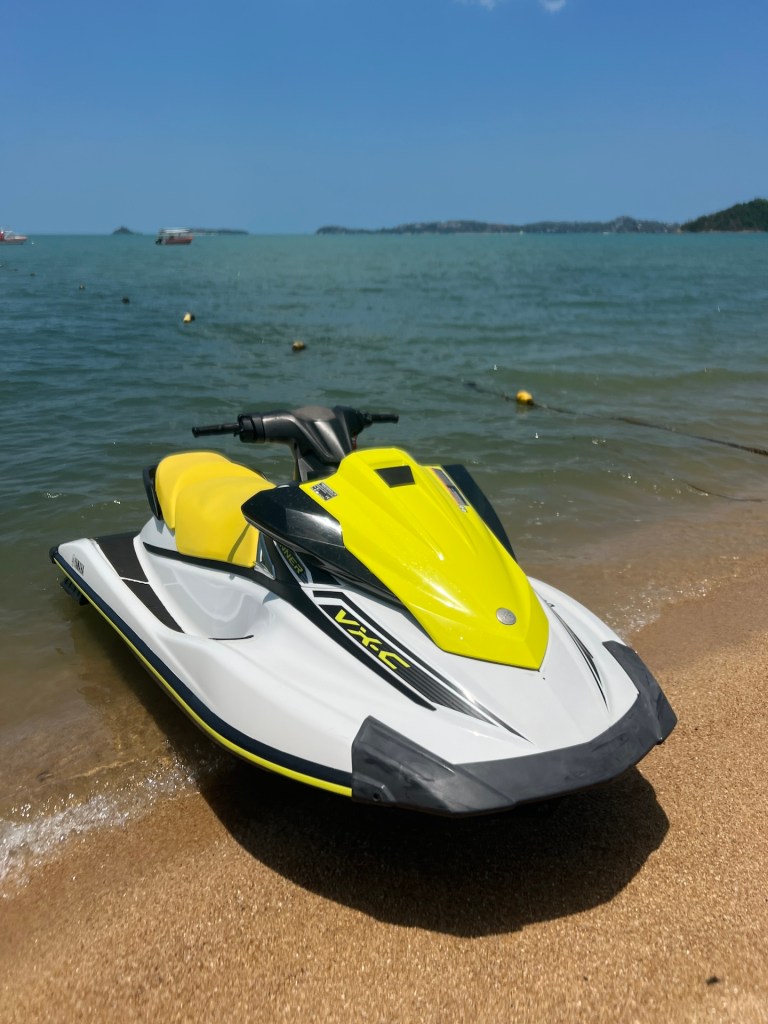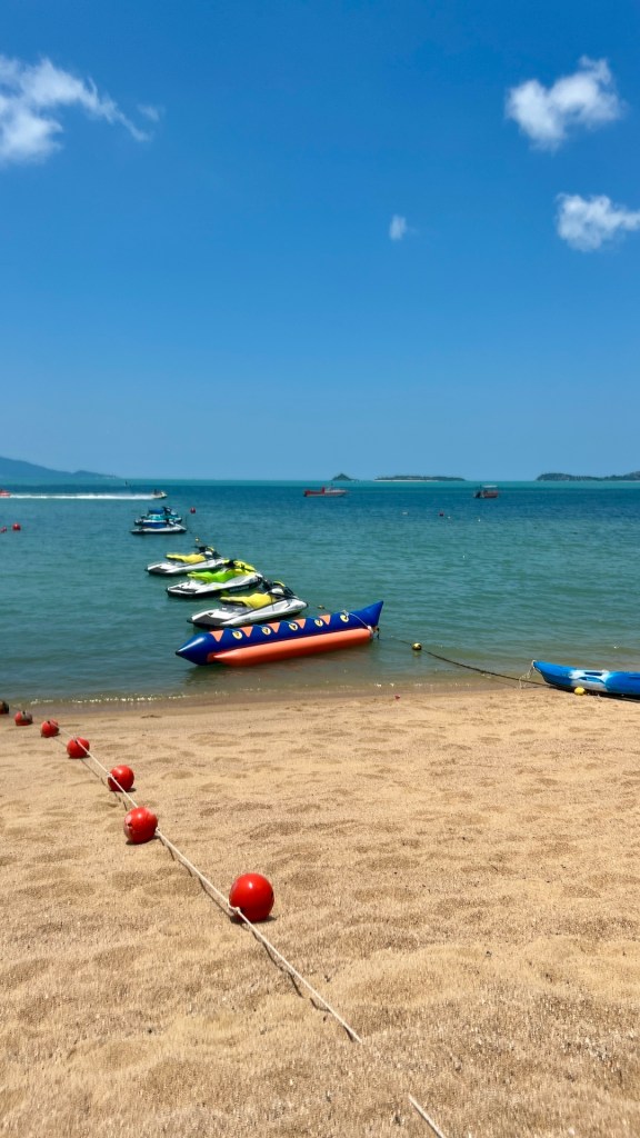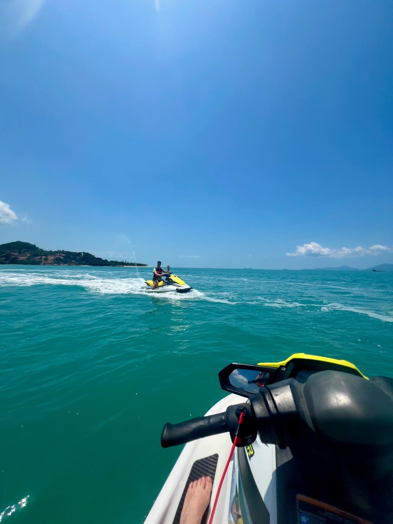 Seit einigen Tagen haben wir richtig Lust auf Jetski… pardon… Wasserbob. Heute ist es endlich so weit. Für 2800 Baht (70,98 EUR) leihen wir uns zwei Bobs und dürfen 20 Minuten übers Wasser heizen. Wir hätten natürlich auch einen nehmen können, um Geld zu sparen… Neee. Allein fahren ist halt auch geil und jeder kann seine Moves und Geschwindigkeiten fahren. Wir erhalten eine kurze Einweisung, wo wir fahren dürfen: 300m von Inseln, Felsen und dem Festland entfernt und 50m von anderen Bobs oder Booten. On, Off und das Wichtigste: Gasgriff 😎. Dann geht die wilde Fahrt los. Wir preschen mit 70kmh durch die Bucht, drehen enge Kreise und erzeugen Wellen, so dass der andere darüber heizen kann. Nach gefühlten zwei Minuten wird die Fahne geschwenkt, wir müssen zurück. 20 Minuten können so schnell vergehen. Das kurze Vergnügen war jeden Cent wert.