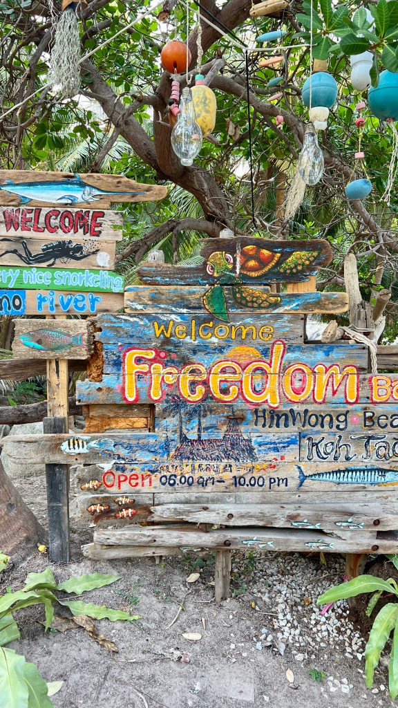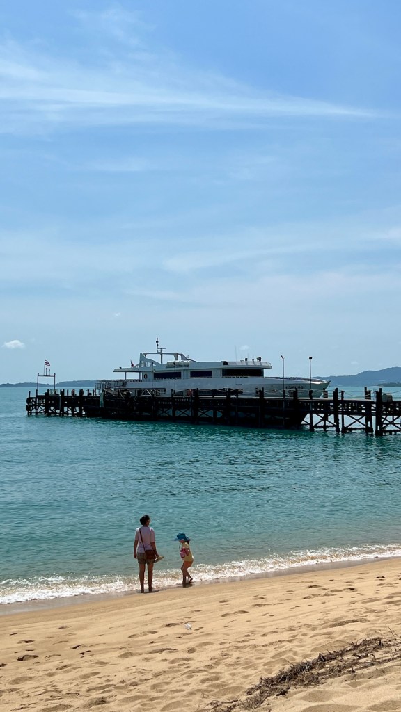 Unsere Überfahrt haben wir dieses Mal über unser Hotel gebucht, da das 100Baht günstiger war als über 12GoAsia. Wir frühstücken ein letztes Mal im The Villager, verabschieden uns von der super engagierten Hotelmanagerin und stehen Punkt 09:40 Uhr am Pralarn Pier. Ab 10 Uhr können wir die Tickets am Schalter abholen. Wir sind wieder begeistert, wie gut alles organisiert ist. Wir erhalten unsere Tickets, zwei Aufkleber für unsere Shirts und das Gepäck. Um 10:45 Uhr startet das Boarding. Auch das: chillig. Wir suchen uns zwei Plätze an Deck und genießen die 2,5 Stunden Überfahrt. Wir haben einen Zwischenstopp bei Koh Phanggan, dann geht es ein ganzes Stück übers offene Meer, bis wir in der Ferne Koh Tao entdecken können.