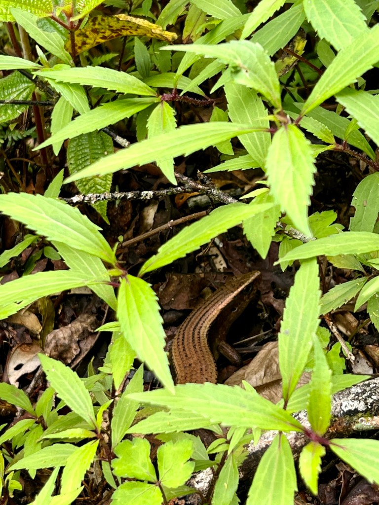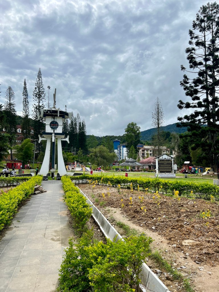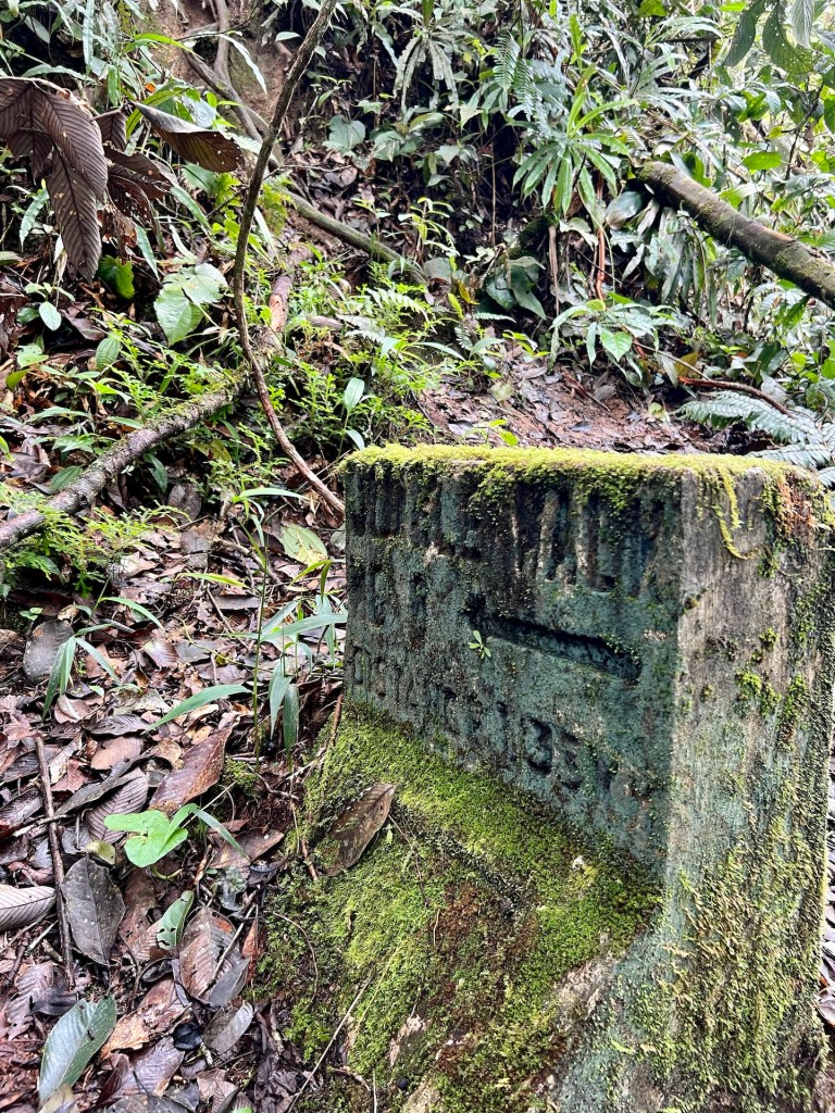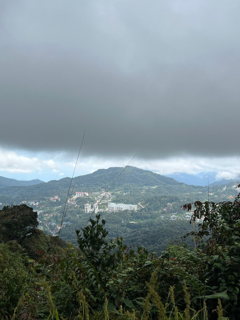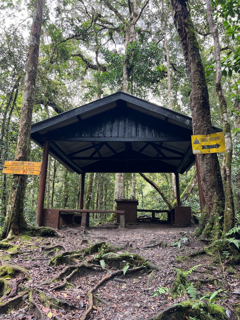 Dschungeltrail 8 liegt gut versteckt einige Stufen hoch zu unserer Linken. Der Name ist und bleibt für eine ganze Weile Programm. Es geht steil durch das Unterholz bergauf. Hier und da spülte Wasser Wurzeln frei die wir nun als Stufen nutzen dürfen. Ansonsten rutschen wir durch Laub und Sandsteinschlamm. Immer wieder haben wir das Gefühl den Weg für ein Stück zu verlassen. Umgefallene Bäume, über gewachsene Sträucher und andere Hindernisse zwingen uns nach „Umwegen“ Ausschau zu halten. Hier wurde schon lange nichts mehr freigeschnitten oder geräumt. Wir kreuzen noch ein matschiges Flussbett. Das lässt uns schon etwas stutzig werden. Im steilen Anstieg kommt uns ein Tourist entgegen der aussieht als hätte er sich verlaufen. Außerdem faselt er irgendwas von „da geht es nicht weiter“. Das lässt uns noch stutziger werden. Wir checken noch einmal Komoot; nein, wir sind auf dem richtigen Weg. Kurz vor dem heutigen Tagesziel stoßen wir auch noch auf ein unverständliches Schild. Es ist die Rede von einem Speicherwald, Weitergehen sei verboten. Wir befinden uns auf einem offiziellen Wanderweg und beim Besprechen des Wanderwegs mit unserem Hotelmanagement hat uns niemand von so etwas erzählt. Außerdem befinden wir uns nur wenige hundert Meter von unserem Tagesziel. Wir vermuten, dass der Bereich rechts vom Wanderweg gemeint sein muss und setzen unseren Weg fort. So gut wie möglich eben. Wir irren kurzzeitig durch tiefsten Dschungel bis wir wieder auf eingetretene Wege stoßen und erreichen dann den Gipfel des Gunung Berembun. Auf 1840 Metern genießen wir einen Apfel, den Ausblick, die Tierwelt und die Ruhe.
