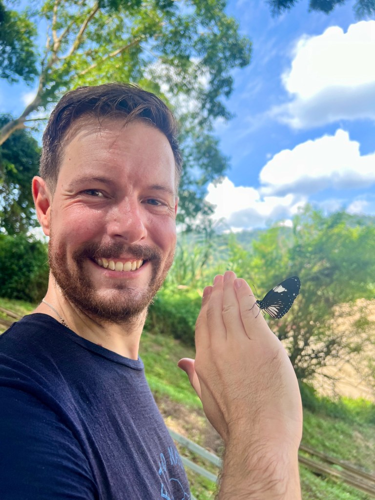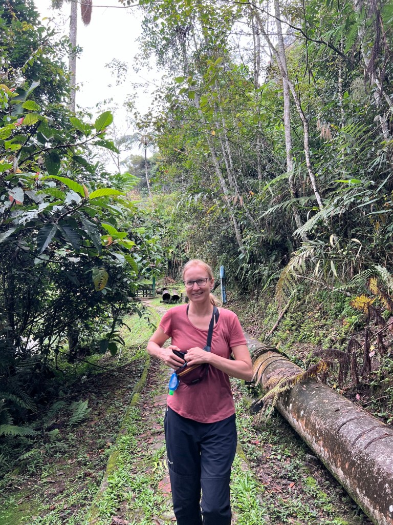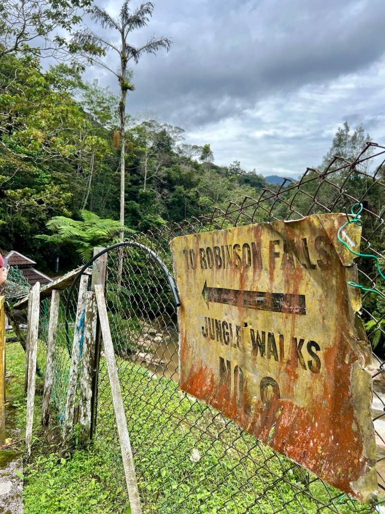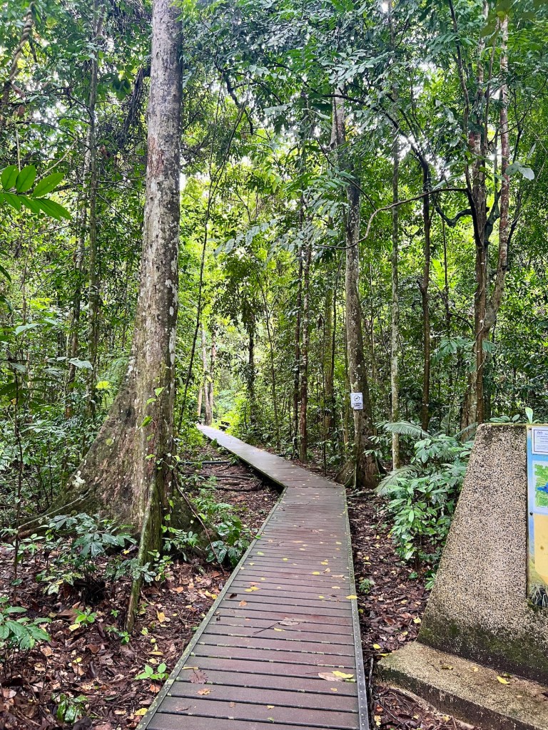 Komoot zeigt noch Alternativen die wir uns vor Ort angucken werden. So geht es los. Äußerst Touristenfreundlich ist der Trail mit einem Steg versehen. So laufen wir auf einem befestigten Weg, 30 – 40 cm über dem Dschungelboden. Wir haben den Eindruck, dass wir uns die Stiefel hätten sparen können. Der Steg ermöglicht es uns aber unser Umfeld genauer zu beobachten, da das Gehen weniger Konzentration erfordert. So erblicken wir interessante Pilze, bunte Schmetterlinge und Vögel. Das Klima fordert uns trotzdem, als wir den ersten Aussichtspunkt erreichen kann Christian sein T-Shirt das erste mal auswringen. Außerdem hört auch der Steg an dieser Stelle schlagartig auf und wir wandern über rutschigen Dschungelboden weiter. Wir erreichen den Gipfel auf 334m 😂 und genießen die Aussicht. Der Dschungel zeigt eine komplett geschlossene Baumkronendecke in der hier und da Nebel feststeckt. Die Geräusche sind geprägt von Affen, Grillen und Vögeln. Der Rundweg den wir über Komoot rausgesucht haben endet für uns an dieser Stelle. Ein äußerst deutliches Schild weißt darauf hin, dass der Weg ab hier nicht mehr ohne einen Guide zu begehen ist. Die aufgezählten Strafen, aber auch die Vernunft wirken und wir entscheiden uns, das Schild ernst zu nehmen. Aber; wir haben etwas weiter unten eine schlecht beschilderte Kreuzung gesehen an der es keinerlei Verbotsschilder gab. Also laufen wir ein gutes Stück zurück und begeben uns dann auf einen abenteuerlichen Rundweg. Der Weg ist erwartet schlecht und steil, aber sehr schön. Wir treffen hier auf keine anderen Touristen. Etwa 1200m vor dem Ziel, stoßen wir an einer Fluss-Badestelle wieder auf den Steg. Und auf Touristen. Willkommen zurück in der Zivilisation