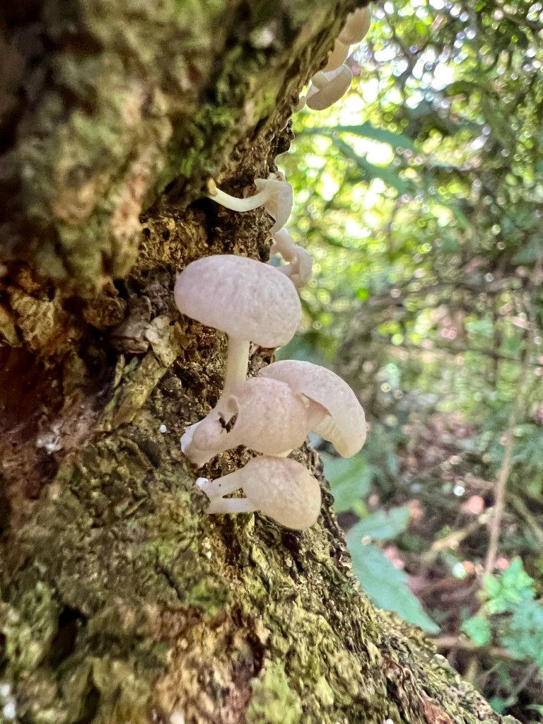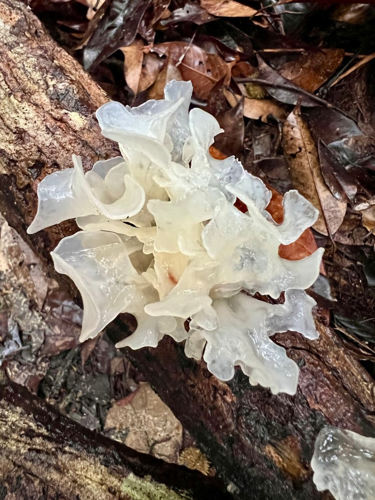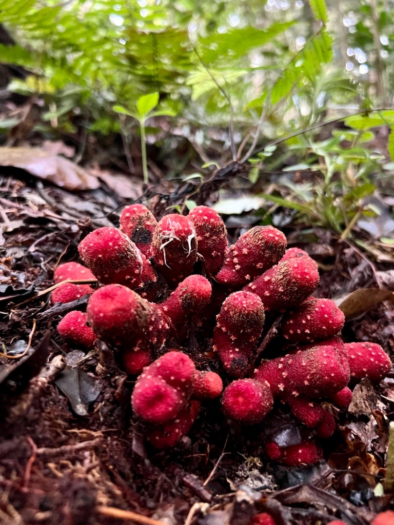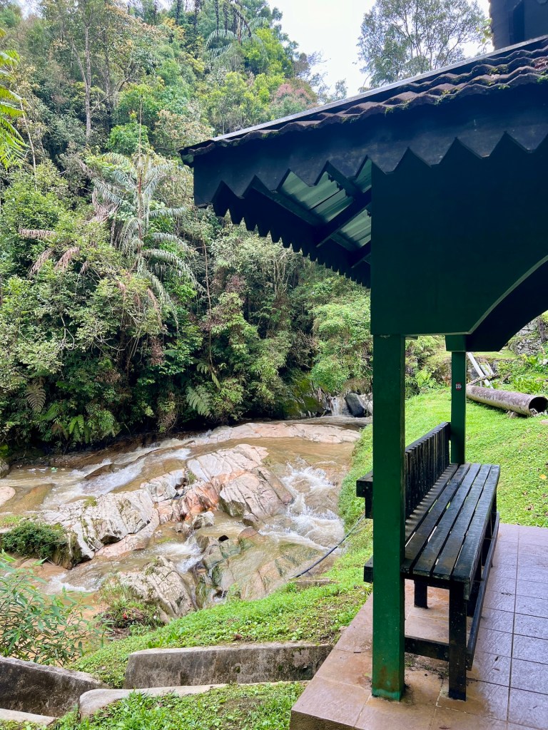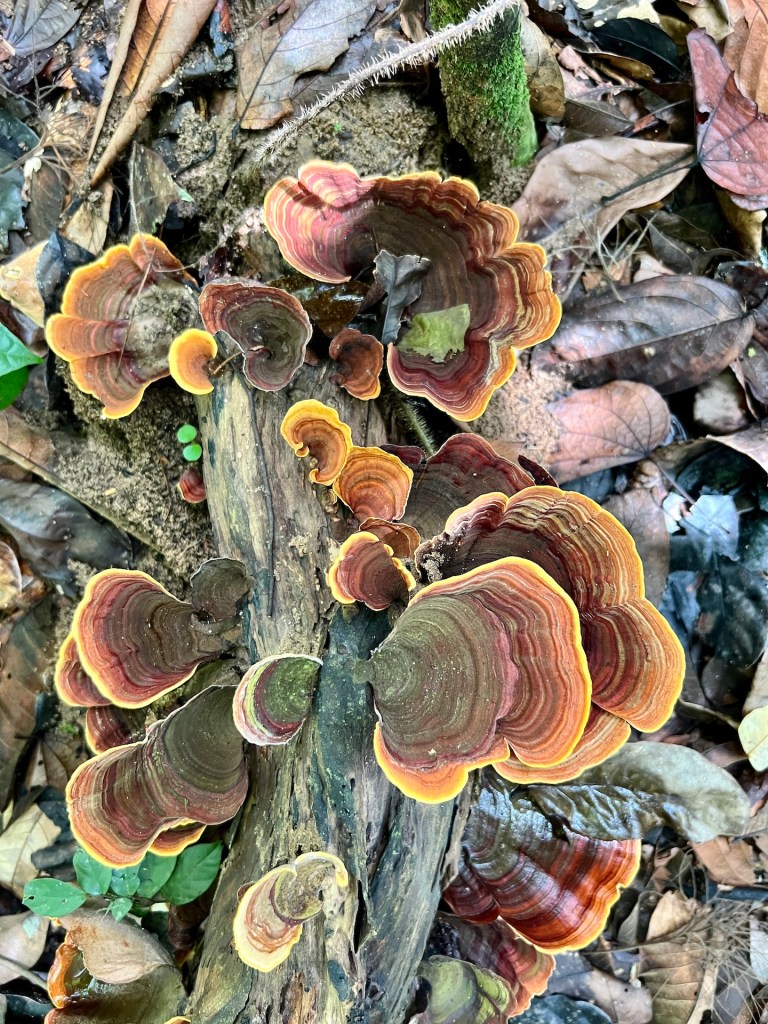 Komoot zeigt noch Alternativen die wir uns vor Ort angucken werden. So geht es los. Äußerst Touristenfreundlich ist der Trail mit einem Steg versehen. So laufen wir auf einem befestigten Weg, 30 – 40 cm über dem Dschungelboden. Wir haben den Eindruck, dass wir uns die Stiefel hätten sparen können. Der Steg ermöglicht es uns aber unser Umfeld genauer zu beobachten, da das Gehen weniger Konzentration erfordert. So erblicken wir interessante Pilze, bunte Schmetterlinge und Vögel. Das Klima fordert uns trotzdem, als wir den ersten Aussichtspunkt erreichen kann Christian sein T-Shirt das erste mal auswringen. Außerdem hört auch der Steg an dieser Stelle schlagartig auf und wir wandern über rutschigen Dschungelboden weiter. Wir erreichen den Gipfel auf 334m 😂 und genießen die Aussicht. Der Dschungel zeigt eine komplett geschlossene Baumkronendecke in der hier und da Nebel feststeckt. Die Geräusche sind geprägt von Affen, Grillen und Vögeln. Der Rundweg den wir über Komoot rausgesucht haben endet für uns an dieser Stelle. Ein äußerst deutliches Schild weißt darauf hin, dass der Weg ab hier nicht mehr ohne einen Guide zu begehen ist. Die aufgezählten Strafen, aber auch die Vernunft wirken und wir entscheiden uns, das Schild ernst zu nehmen. Aber; wir haben etwas weiter unten eine schlecht beschilderte Kreuzung gesehen an der es keinerlei Verbotsschilder gab. Also laufen wir ein gutes Stück zurück und begeben uns dann auf einen abenteuerlichen Rundweg. Der Weg ist erwartet schlecht und steil, aber sehr schön. Wir treffen hier auf keine anderen Touristen. Etwa 1200m vor dem Ziel, stoßen wir an einer Fluss-Badestelle wieder auf den Steg. Und auf Touristen. Willkommen zurück in der Zivilisation