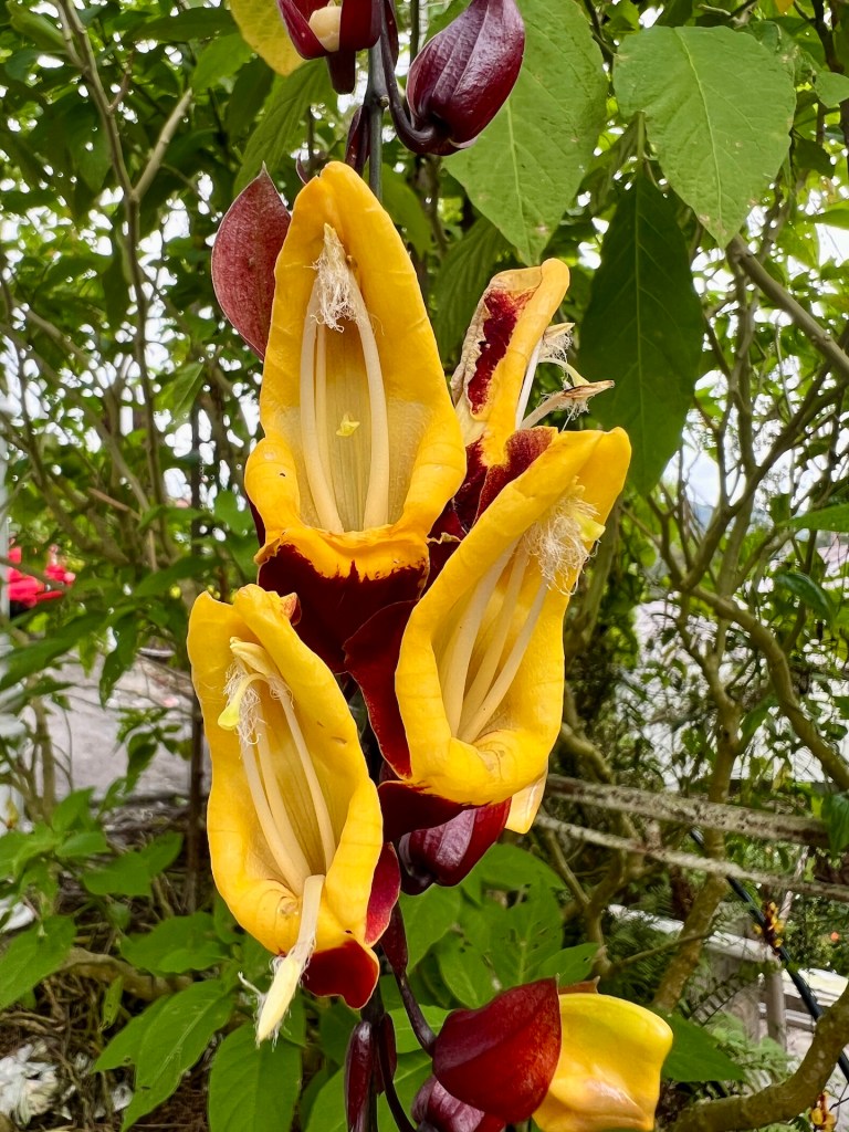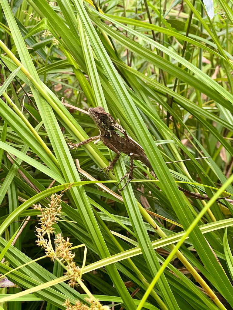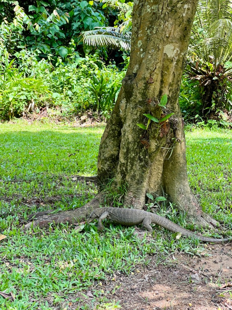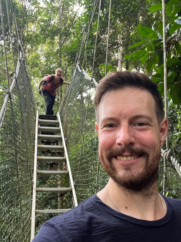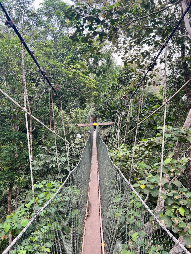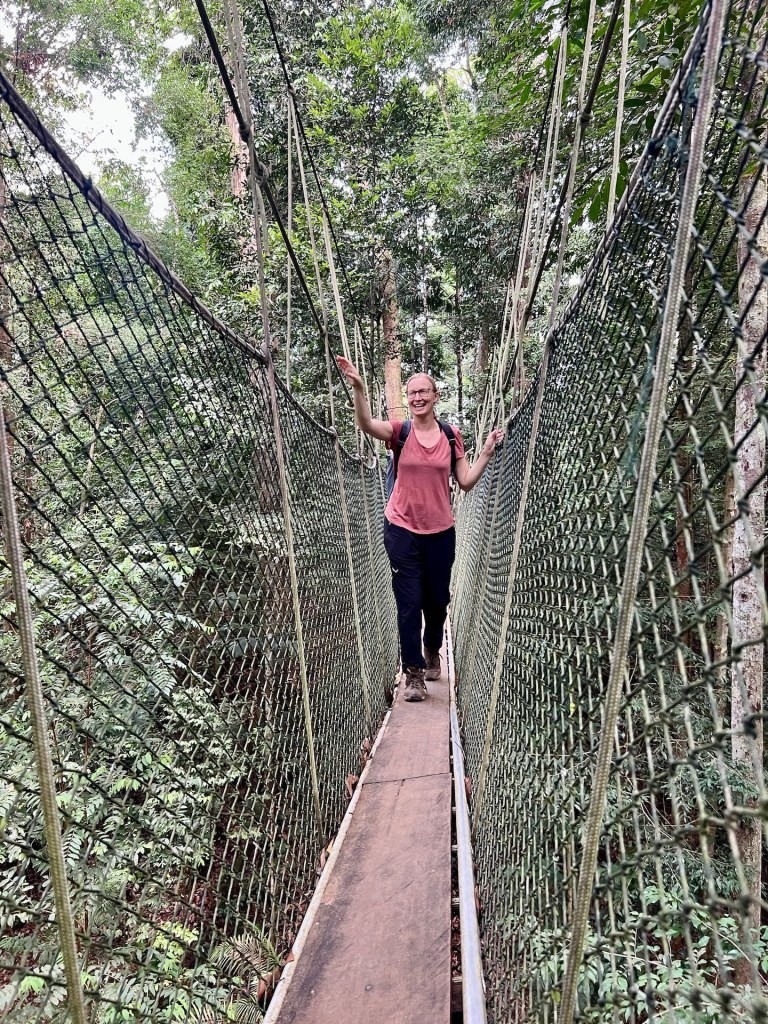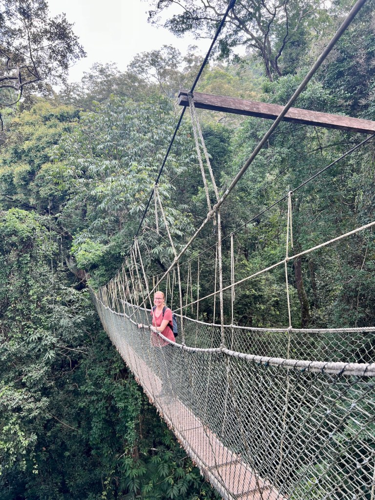 Weiter geht es. Der Canopy-Walkway ist eine Hängebrückenkonstruktion in den Baumwipfeln des Dschungels. An der höchsten Stelle stolze 47m über dem Boden. Wir erreichen den Startpunkt und stellen erleichtert fest, dass hier keine 400 Menschen auf Einlass warten. Unsere Tickets werden mit der Nummer 51 versehen, aufgerufen wird 37. Kann so lange nicht dauern. Wir treffen auf Dominica, vorgestern haben wir uns beim Mittagessen kennengelernt. Wir quatschen kurz über Reisepläne da wird sie auch schon ausgerufen; 47! Jeder Hängebrückenabschnitt darf zeitgleich von maximal vier Personen betreten werden. So kann sich das hier schon mal stauen, aber wir sind nach nicht einmal 25 Minuten Wartezeit an der Reihe. Über einen kleinen Turm gelangen wir zur ersten Hängebrücke. Circa 30m lang geht es über einem Hang in die Baumgipfel. Es folgen vier oder fünf weitere Brücken die jeweils an einer Plattform im Baum enden. Jana, mittlerweile recht schwindelfrei, schwingt über die Brücke bis hinter ihr ein erwachsener Mann das kreischen beginnt. Das war wohl zu viel für ihn 🫣 Wir genießen mit 10m Sicherheitsabstand den Blick durch die Baumkronen, auch wenn wir bis auf ein paar Vögel keine besonderen Tiere zu Gesicht bekommen. Der Eintritt für dieses Abenteuer beläuft sich übrigens auf fünf Ringet, also einen Euro. Das ist es auf jeden Fall Wert. Wir sind etwa 15 Minuten über Hängebrücken gelaufen. Fotografieren ist dabei übrigens „untersagt“. Klar – bei Hochbetrieb halten die Influenzer sonst ja den ganzen Verkehr auf, aber wir haben natürlich ein paar Bilder für euch: