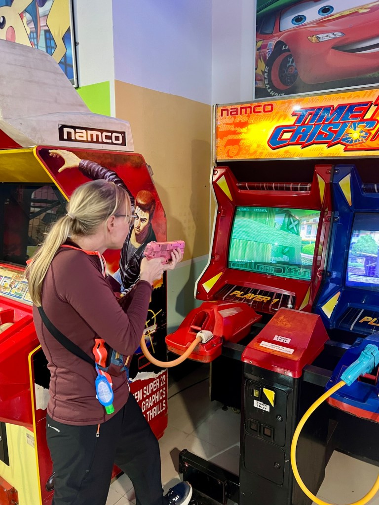Als wir der Erschöpfung nahe sind ziehen wir weiter in die anliegende Spielhalle. Klassiker von SEGA und anderen namenhaften Arcadespielgeräten stehen zur Auswahl. Noch bevor wir uns entscheiden können sehen wir einen Verantwortlichen in Richtung des Autoscooter gehen. Den schnappen wir uns! Mittlerweile ist auch ein anderes Pärchen am Autoscooter. Wir versuchen zu erklären was das Problem ist. Der junge Mann scheint uns nicht zu glauben, schaltet uns aber dann doch zwei Fahrzeuge frei. Wir freuen uns und rauschen im Schneckentempo los. Gnadenlos krachen wir sanft in einander. Reifen quietschen, nicht. Spaßig ist es trotzdem. Wir haben knapp fünf Minuten einen Adrenalinspiegel weit über dem Erträglichen. Dann ist die rasante Tour auch schon wieder zu Ende. Im Anschluss setzen wir uns in den Arcade-Racer in einem spannenden Rennen gewinnt Jana nach einem fiesen Foul. Dann gibt es einen Arcade-Shooter und eine Runde Airhockey. Wir finden vier weitere Wertmarken und gönnen uns noch ein spannendes Motorradrennen! Unglaublich lustig. Wir sind bestimmt eine Stunde gut unterhalten. Das ganze für etwa einen Euro pro Person 🤭