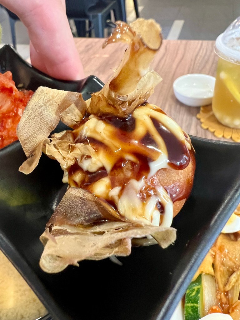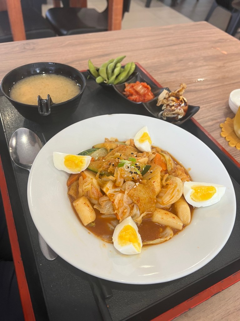 Wir schaffen es ohne Umwege in den Guardian und erledigen unsere Einkäufe. Hungrig sind wir jetzt. Die letzten Tage haben wir uns hauptsächlich indisch ernährt. Jetzt haben wir Appetit auf etwas anderes und finden ein japanisch-koreanisches Pizza Crossover. Klingt erst mal merkwürdig, ist aber eben so 😉 Jana bestellt sich eine Pizza, Christian greift zu einem Reiskuchen Gericht mit Suppe und Fingerfood. Einer von uns beiden hat eine gute Wahl getroffen 😜 Wir teilen alles und bekommen zum Abschied noch ein Dessert geschenkt. Ok – wir haben dafür eventuell eine Bewertung schreiben müssen. Da wir das aber eh getan hätten, ist das Dessert wie geschenkt. Wir werden auf dem Rückweg nicht nass und schaffen es noch unsere Rucksäcke zu packen bevor wir besonders früh ins Bett gehen.