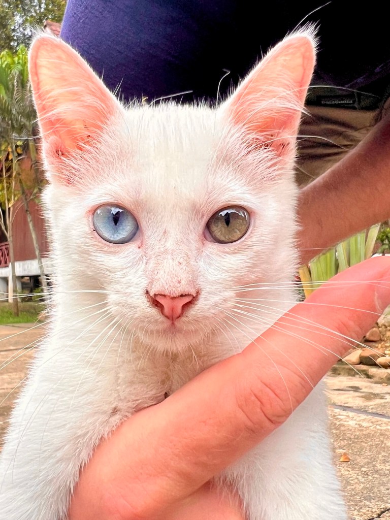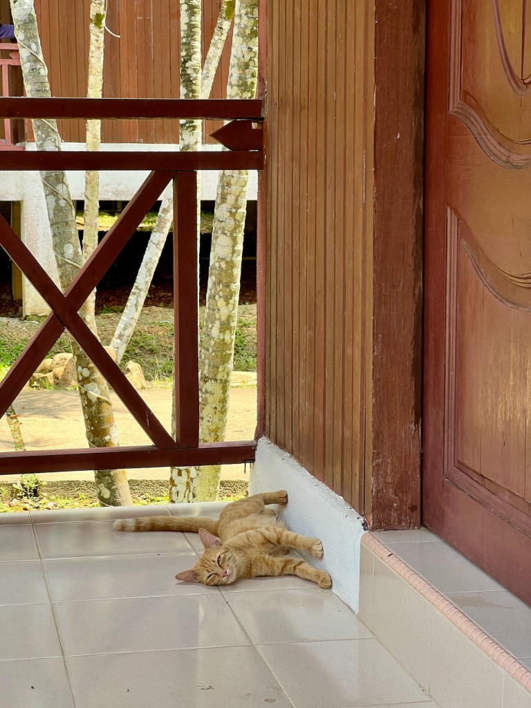 Check-In läuft reibungslos und unser Zimmer ist auch bereits fertig. Das Resort besteht aus kleinen Häusern auf Stelzen in denen sich, je auf Eck, vier Zimmer befinden. Eine Katze schläft auf der Terrasse vor unserer Tür. Die Unterkunft besteht aus einem Schlafzimmer mit Tisch, Kleider- und Kühlschrank und ein Bad mit richtiger Dusche! Sehr gut.