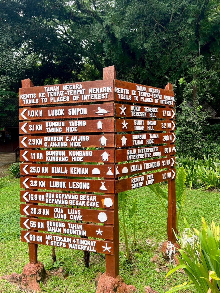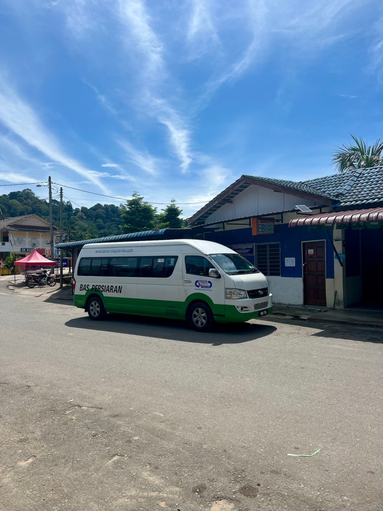 Wir werden aufgerufen und mit den anderen Reisenden auf die unterschiedlichen Minivans verteilt. Für uns geht es jetzt mit fünf anderen Reisenden über eine kurvige Straße bis in den kleinen Ort Kuala Tahan. Dieser liegt direkt an der gegenüberliegenden Flussseite vom Nationalpark. Im Zentrum werden alle anderen rausgelassen, dann werden wir vom Fahrer bis vor den Eingang unserer Unterkunft gebracht. Danke Louis für die Organisation 🤩