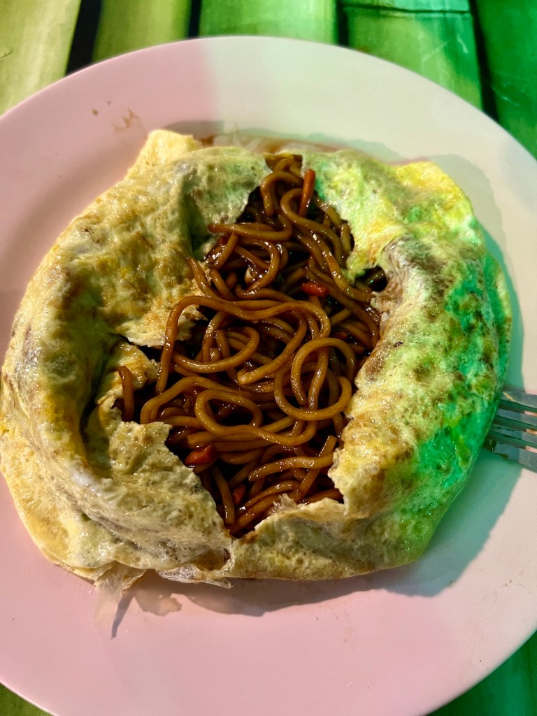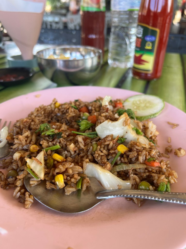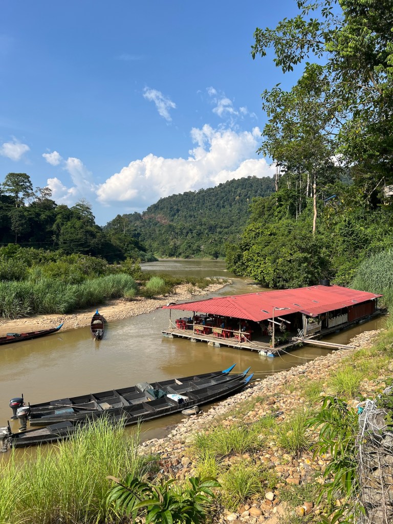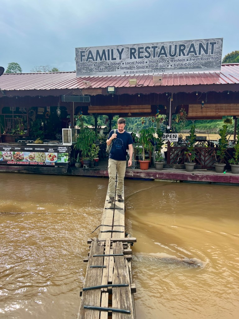 Wir richten uns ein und erkunden dann die Gegend. Wir haben auch noch eine Mission für heute; Bargeld besorgen. Sollte ja kein Problem sein. Wir fragen an der Rezeption nach dem nächsten ATM; soweit sie wüsste gebe es keinen. Ähm ok?! Auch die Frage ob wir im Hotel an Bargeld kommen würden verneint sie. Aber vielleicht bei den Minimärkten, einfach mal fragen. Also spazieren wir los und klappern einen Markt nach dem nächsten ab. Fehlanzeige. Drei haben nicht einmal ein Kartenlesegerät, der eine mit, verneint unser Gesuch auch. Wir zählen unser Bargeld – Knapp 280MYR also weniger als 60EUR. Bei fünf Tagen etwa 12EUR am Tag 😬 Leicht frustriert schlendern wir zum Fluss und besichtigen die Floating Restaurants für die das Dorf auch bekannt ist. Dann entdecken wir an einem ein Visa Symbol! Was ein Glück wir werden nicht verhungern 🙃 Erleichtert entscheiden wir uns erst einmal etwas Trinken und Essen zu gehen. Wir werden von fünf halbstarken Jungs begrüßt, auf ihrer eigenen Sprache amüsieren sie sich köstlich über die Touristen und äffen uns nach. Etwas unangenehm, aber der Wunsch nach Erfrischung lässt uns das aushalten. Die Pommes und der Crepes sind mittelmäßig gut, dafür können wir den kleinen Betrag mit unserem Plastikgeld begleichen. Als wir weiterziehen fragen wir noch an zwei weiteren schwimmenden Restaurants nach, Kartenzahlung ist kein Problem. Sehr gut. Erleichtert und erfrischt geht es für uns zurück in die Unterkunft. Wir haben für heute Abend vorgesorgt und gestern noch vier frische Maiskolben gekauft. Glücklicherweise ist für eine Veranstaltung ein Buffet aufgebaut. Wir fragen freundlich nach, ob wir uns daran beteiligen könnten. Für zwei Euro pro Person dürfen wir mitessen. Sehr gut. Das ziehen wir unseren Maiskolben natürlich vor 😉 So geht der Tag doch noch kulinarisch zu Ende.