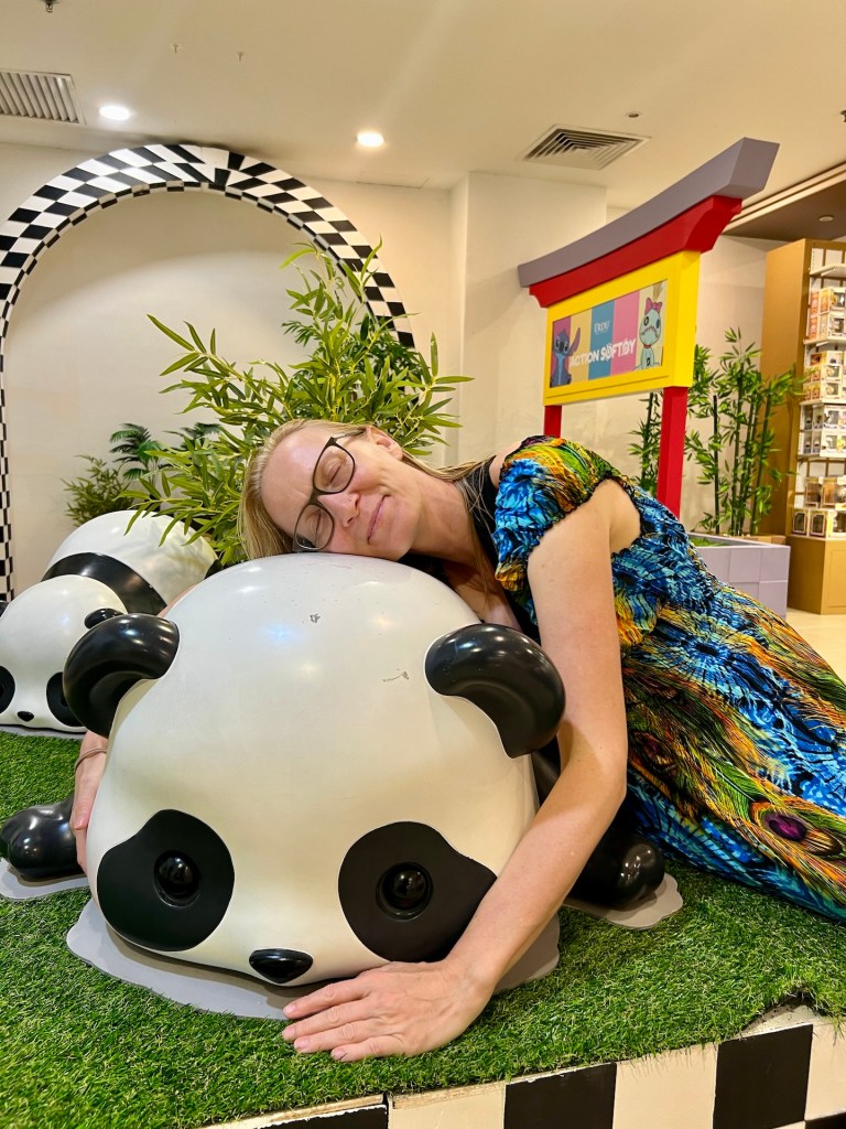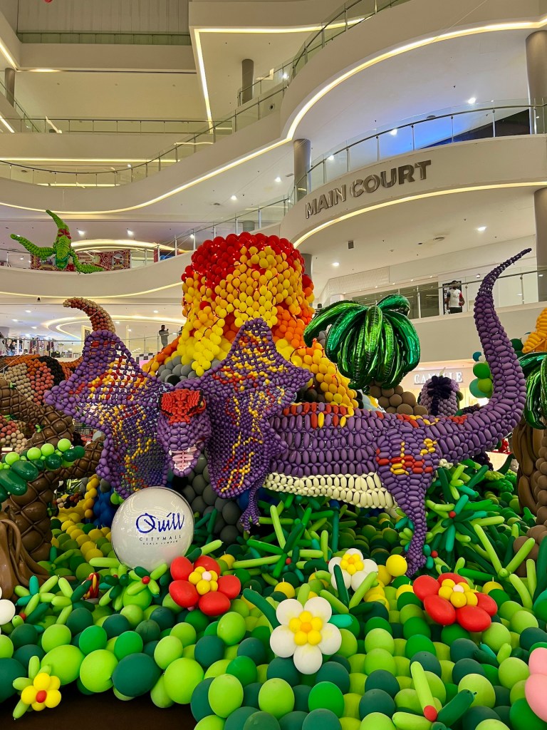 Leicht unterkühlt aber glücklich ziehen wir uns um. Bevor es Zeit fürs Abendessen ist, müssen wir noch einkaufen. Brot haben wir ja, aber für die nächsten Tage brauchen wir noch einiges. Also ab in die angrenzende Mall. Den Eingang zu finden ist schon einmal nicht ganz so leicht, wenn man an der Warenannahme startet. Als wir dann über den „Ost-Eingang“, ihr könnt euch vorstellen wie groß das Ding sein muss, eintreten, sind wir kurz offline. Mindestens sieben Etagen, vor uns ein Arrangement aus Luftballons, das eine Dinosaurier Szene zeigt. Unglaublich.
