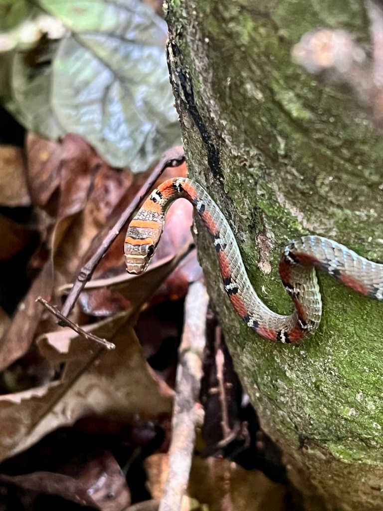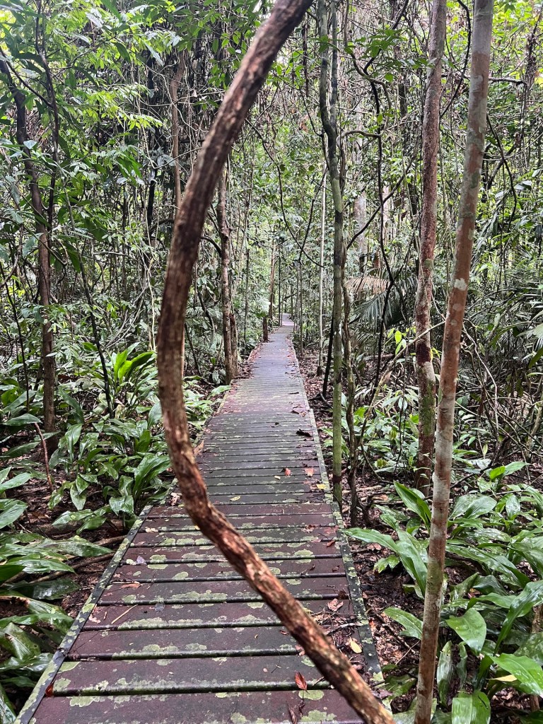Viel besser startet der Samstag. Wir kaufen erst einmal Busticket, um nach Kuala Lumpur zu kommen. Morgen ist bereits Abreise, da wollen wir auf jeden Fall noch einmal etwas unternehmen. Zwar bleiben nicht viele Möglichkeiten, aber wir gucken mal was so kommt. Die Idee ist mit einem Boot den Fluss ein Stückchen zu folgen, absetzen lassen und zurück laufen. Die Idee ist hervorragend, allerdings stellen wir schnell fest, dass niemand daran interessiert ist, sie umzusetzen. Am Fluss liegen unzählige kleine Boote mit denen die Touren hier angeboten werden. Eine solche möchte man uns auch verkaufen, aber an einer Individualtour ist keiner interessiert. So entscheiden wir uns, den Nationalpark zu betreten und die Parkwächter nach Lösungen zu fragen. Weitere Wege als die Gipfeltour sind für die Öffentlichkeit nicht freigegeben. Aber der Canopy-Walkway sei heute geöffnet. Allerdings wären bereits 400 Gäste dorthin unterwegs. Gut was solls. Wir bezahlen die entsprechenden Gebühren und machen uns auf den Weg. Vorbei an einem Ausguck führt der Weg durch ein Sumpfgebiet bis wir wieder auf den uns bekannten Weg kommen. Diesem folgen wir diesmal ohne zum Gipfel abzubiegen. Unterwegs treffen wir auf Verhältnismäßig wenig Besucher, was uns für unser Ausflugsziel hoffen lässt. Am Wegesrand entdecken wir erst einen Tausendfüsser und später eine Schlange! Wir erfahren von einem vorbeikommenden Tourguide, dass es sich um eine Paradise Tree Snake handelt. Diese seien nicht giftig (Google sagt da was anderes) und können auf der Jagd von Baum zu Baum gleiten! Richtig cool oder nicht? Zum Glück ist die Schlange kaum dicker als der kleine Finger und maximal 40cm lang. Wie gefährlich kann das schon sein?! 😏