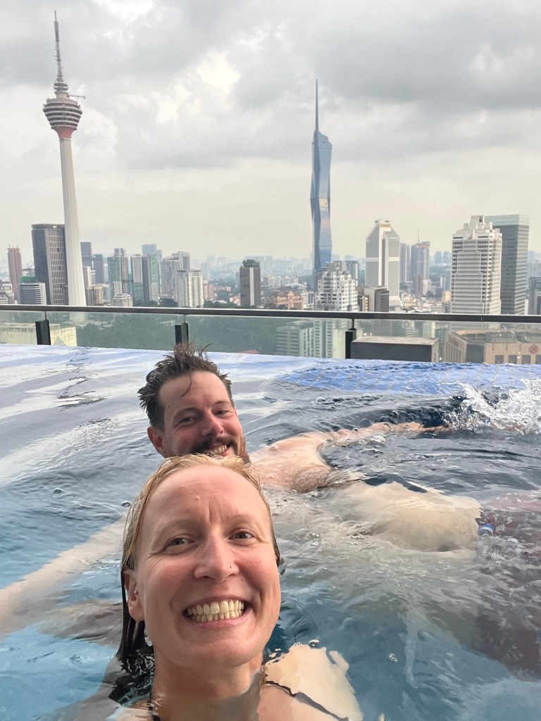 Leider ist es bereits Zeit wieder aufzubrechen. Die Haltestelle ist keine 200m entfernt. Wir haben eigentlich erwartet hier auch wieder einzusteigen, es dauert eine ganze Weile bis wir realisieren, dass unser Van auf der anderen Straßenseite steht und bereits alle auf uns warten. Auf dem Weg von Jerantut nach Kuala Lumpur sagt Myra unser Treffen gesundheitsbedingt ab. Das ist in sofern doof, dass wir uns zum einen natürlich gefreut haben, sie wieder zu sehen und zum anderen, weil wir auch zum Übernachten eingeladen waren 😑 Gut jetzt heißt es also eine neue Unterkunft suchen. Wir stellen schnell fest, dass das aktuell gar kein Problem ist. In KL gibt es unheimlich viele AirBnB’s. Ab 20EUR die Nacht geht es los. Die meisten liegen in einem der Hochhäuser und bieten zusätzlich Fitnessstudios, Pools und so weiter. Wir buchen ein Apartment für etwa 26EUR pro Nacht mit Blick auf die Petronas Towers.