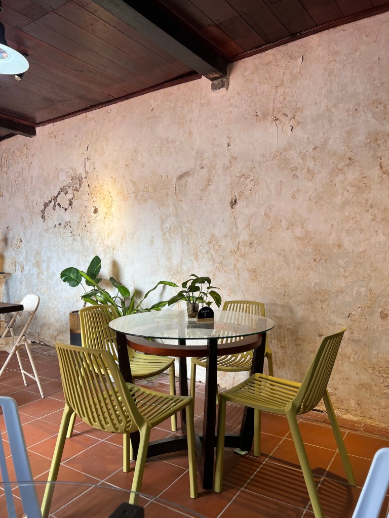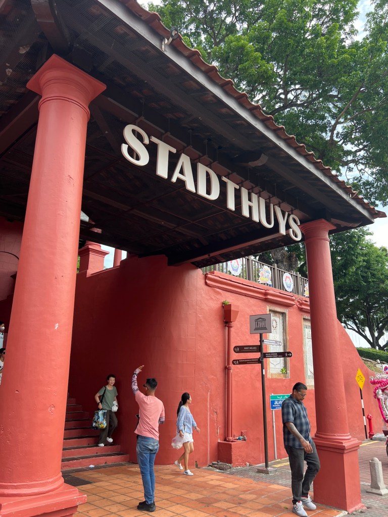 Wir ziehen weiter zum Stadthuys. Uns ist nicht nach Museum also sparen wir den Eintrittspreis für das Stadthuys. Wir schlendern noch einmal drum herum und erfahren einiges über die Geschichte des ursprünglich im niederländischen Baustil errichteten Gebäudes. Die Briten haben es später ebenfalls für die administrative Verwaltung genutzt und hier und da einige bauliche Veränderungen vorgenommen. So langsam verspüren wir ein leichtes Hüngerchen. Und wir wissen auch genau wo wir etwas dagegen tun können. Wir laufen zielsicher zum Daily Fix Cafe. Während Jana unsere Bestellung aufgibt gesellen sich zwei Studenten an unseren Tisch. Unser zweites Interview in Melaka. 😁 Während es im ersten noch um die Stadt und den Grund unseres Besuches ging, werden wir heute über das Essen ausgequetscht. Auch wenn das unser Spezialgebiet sein sollte, können wir dem Pärchen nicht die gewünschten Antworten geben. Wir haben die Spezialitäten der „Peranakan“ Küche bisher nicht gekostet. Die Mischung aus chinesischer Küche und malaysischer Zutaten klingt aber interessant und wir sind dankbar für den Tipp 😇 Apropos: der Kuchen war zwar erste Sahne, aber das reden über so viel Essen hat Lust auf ein anständiges Abendbrot gemacht. Hatten wir schon von unserem Lieblingsrestaurant erzählt? Genau, wir landen wieder im Mee Tarik Warisan Asli.