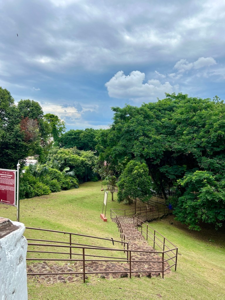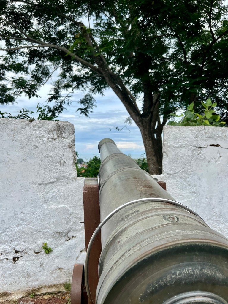 Der Dienstag startet umso motivierter. Aus lang vergangenen Zeiten gibt es in Malakka noch einige historische Sehenswürdigkeiten. Wir starten in Richtung Capela de São João Batista. Auf halbem Weg liegt unser Frühstückslokal, das Eggxtra Cafe. Aus einer großen Karte kann man sich hier Sets aus 3, 5 oder 7 Gerichten zusammenstellen. Nice. Satt geht es weiter zur alten Festung. Der Weg ist etwas beschwerlich. Bürgersteige gibt es nur sporadisch, die Luft ist besonders geladen da ein Gewitter droht und die Anlage liegt logischer Weise auf einem Hügel. Wir erreichen unser Ziel trotzdem und können von hier aus auf die Straße von Malakka gucken. Die Meerenge zwischen Indonesien und Malaysia war früher schon von besonderer Bedeutung. So diente diese Bastion erst den Portugiesen, dann den Niederländern und bis zum Schluss den Briten. Die Mauern bestehen aus geschlagenen Lavasteinen und Kanonen geben eine Idee wie es hier gewesen ist. Das Wetter schlägt um und auf Janas Gesundheit. Wir entscheiden uns erst einmal in die Unterkunft zurückzukehren und das Wetter passieren zu lassen. Außerdem gibt es noch einiges was wir erledigen wollen. Erst zum Abendessen trauen wir uns wieder vor die Tür. Wir besuchen in der gegenüberliegenden Mall unser Lieblingsrestaurant Mee Tarik Warisan Asli. Hier gibt es handgezogene Nudeln in malaysisch-chinesischer Cuisine. Sehr lecker. Zurück in der Unterkunft widmen wir uns wieder unseren Projekten bis wir gegen Mitternacht erschöpft ins Bett fallen.