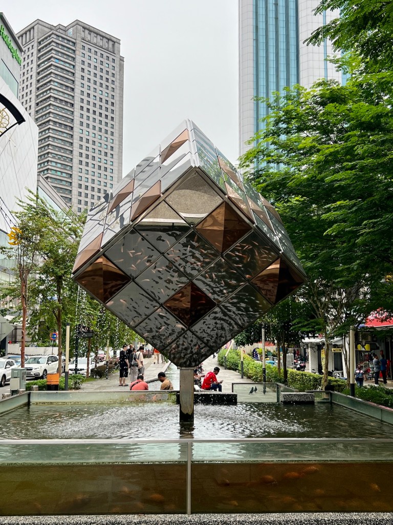 Da wir nicht vor haben lange zu bleiben und auch nur wenige Tage in Singapur planen, wollen wir uns in der indonesischen Botschaft ein Visa besorgen. Wir verpassen unsere Bushaltestelle und steigen in der Nähe des Flusses aus, der Malaysia von Singapur trennt. Da wir jetzt eh schon hier sind, laufen wir erst durch die Heritage Street wo wir einen ganz besonders coolen Pflanzenshop entdecken und dann durch das komplette Stadtzentrum von JB laufen. Denkwürdigstes Highlight hier, ein künstlicher Bach der einem spiegelndem Würfel entspringt. Der 320m lange Bach ist über und über voll mit Fischen die sich in den kaskadenartigen Becken quasi stapeln. Finden wir nicht so geil. Weiter geht es an einigen Luxushotels vorbei Richtung Botschaft. Wir laufen eine ganze Weile durch ruhigere Gebiete und stellen dann vor Ort fest, dass diese leider geschlossen hat 🫣 Zurück in die Stadt. Kaffe und Kuchen rufen nach uns. Im Cafe angekommen entscheiden wir uns doch für die veggie Quiche. Wir wundern uns massig als wir Ente in dieser entdecken. Auf Nachfrage warum man die Quiche mit Ente Veggie Quiche nennt wird uns verdutzt erklärt: „na weil da ist doch auch Gemüse drin“. Na klar, danke.