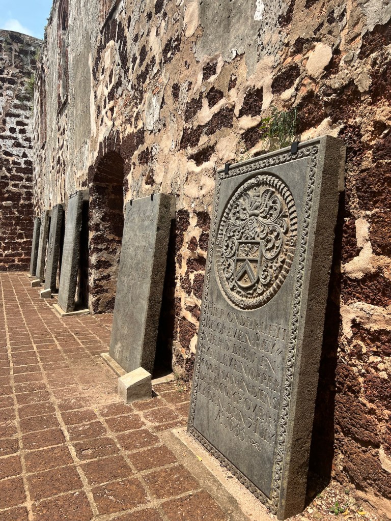 Weiter geht es auf den Bukit Melaka. Bukit ist das harmlosere Wort für Gunung (Berg) und bedeutet Hügel. Ein Glück. Wir steigen ein paar Stufen hoch und stehen vor der Kirchenruine St.Paul. Die Außenmauern sind größtenteils sehr gut erhalten, das Dach der Kirche fehlt weitgehend. Zwischen den Grabsteinen von wichtigen Persönlichkeiten aus der Geschichte Melaka’s tummeln sich einige Hobby-Modells mit ihren Privatfotografen. Wir erkunden alles so genau wie möglich und vermissen wie so oft Infotafeln.