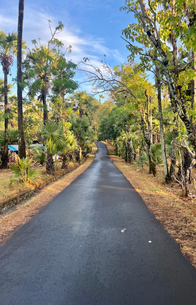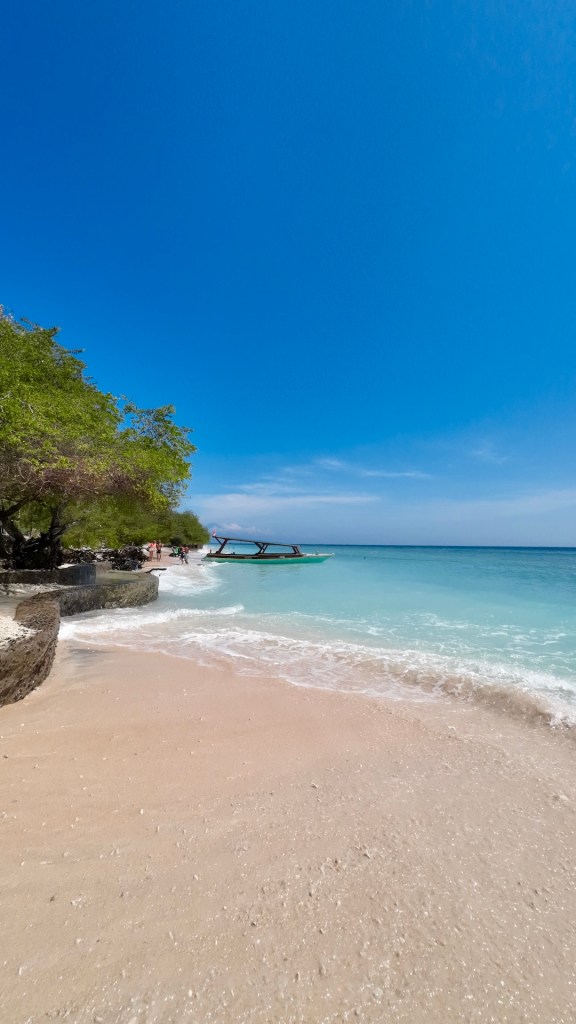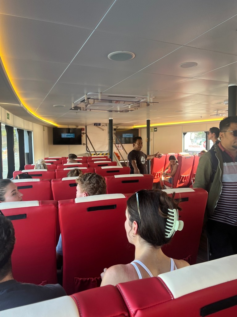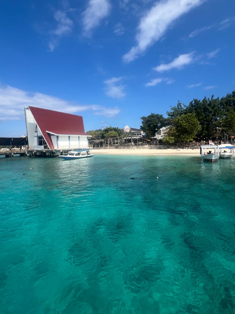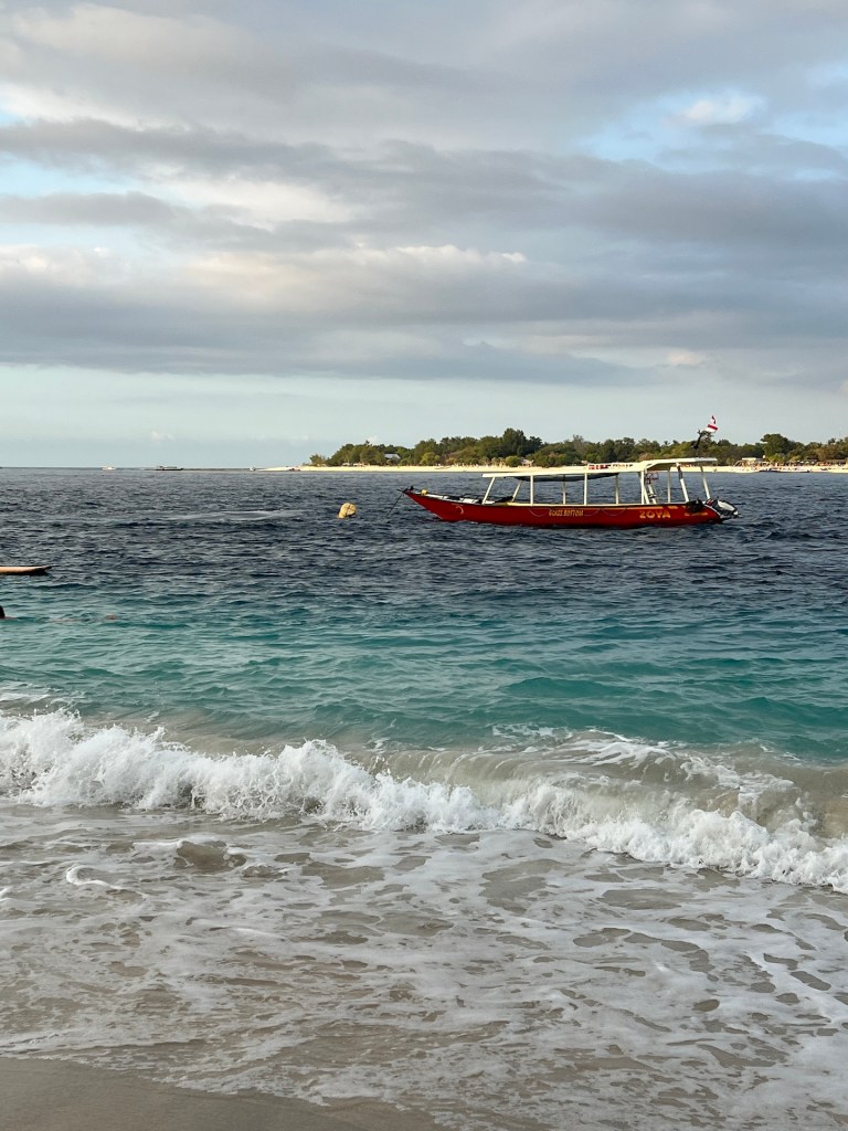 Vom Büro zum Hafen läuft man etwa 5 Minuten, mit unseren Rucksäcken kein Problem. Die Trolleytouristen haben allerdings Schwierigkeiten ihre Rollen auf dem holprigen Weg nicht zu verlieren. An der Fähre angekommen teilt man uns mit, was wir schon vermutet haben. Es ist die falsche Fähre, unsere wird etwa gegen 08:45 zum Boarding bereits stehen 🫣 Also entspannt Zeit für ein Frühstück in einem naheliegenden Warung. Einen Bananenpancake später steigen wir in eine recht moderne Hochgeschwindigkeitsfähre. Alles wirkt recht gut organisiert und kurze Zeit später stechen wir in die See. Unser Ziel: Gili Trawangan. Als wir die Insel erblicken amüsieren wir uns, die ist soooo klein 🤣