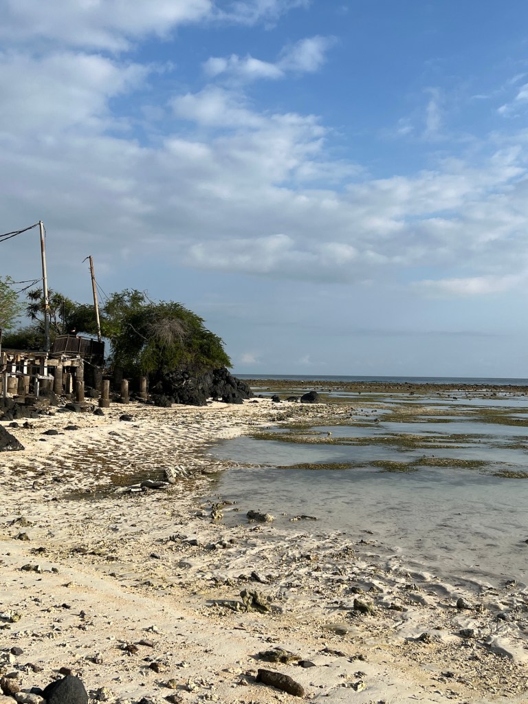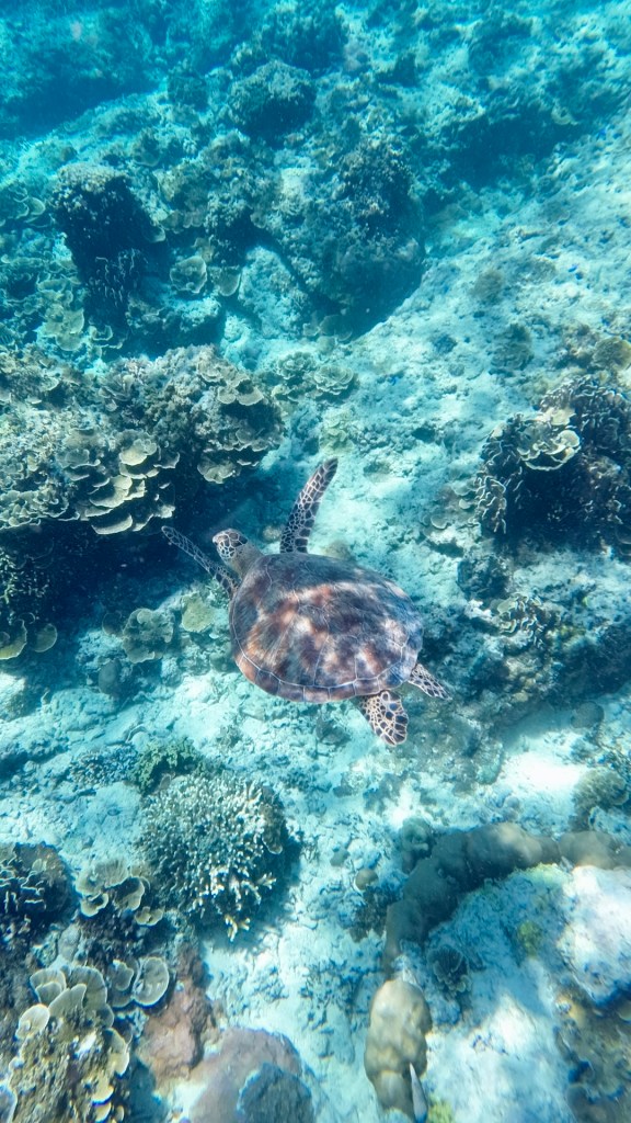 Und tatsächlich, nicht nur dass die Sonne hinter einer dicken Wolkendecke verschwindet, die Bucht ist ziemlich leer und das Wasser ist absolut klar und ruhig. Wir entdecken den im Wasser platzierten Tempel und schnorcheln eine ganze Weile vor uns hin. Es gibt unzählige Fischschwärme und -arten, die wir noch nie zuvor gesehen haben. Sehr beeindruckend. Nach und nach kommen mehr und mehr Menschen dazu. Nicht wenige verhalten sich rücksichtslos und egoistisch. Einige stehen zum Richten des Schnorchels auf den Korallen, andere kollidieren mit einem ohne sich zu entschuldigen. Wir müssen regelmäßig den Kopf schütteln. Wusstet ihr zum Beispiel, dass Meeresschildkröten einen feinen Biofilm auf ihrem Panzer tragen der bei Berührung mit menschlichen fettigen Grabschern zerstört wird und Angriffsfläche für Keime, Krankheiten und andere Schädlingen bietet? Nein? Da machen sich vermutlich auch viele andere Touristen keine Gedanken zu. 😒