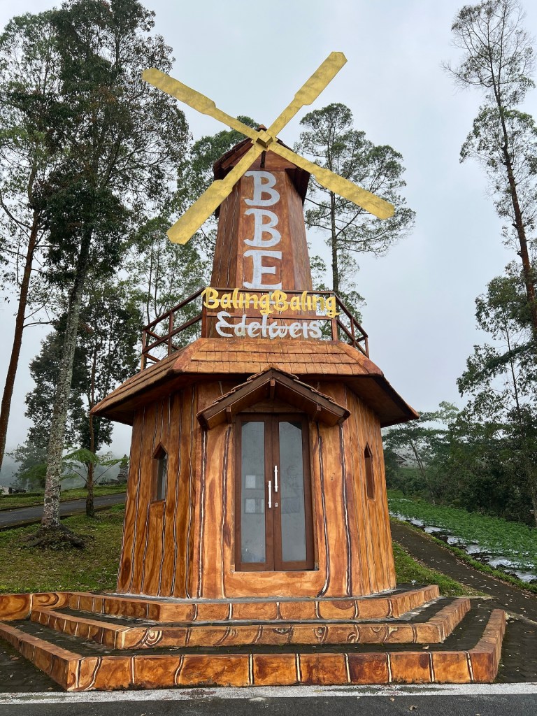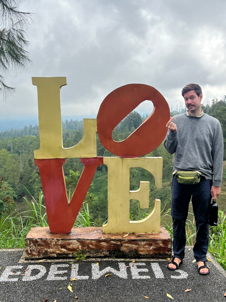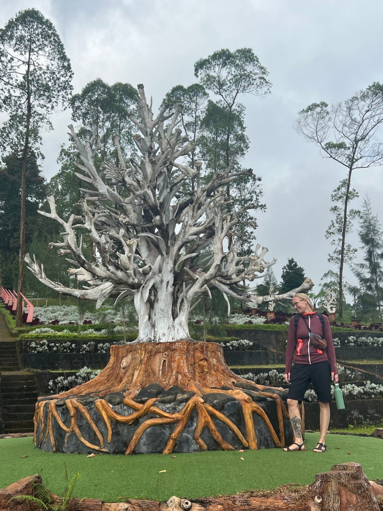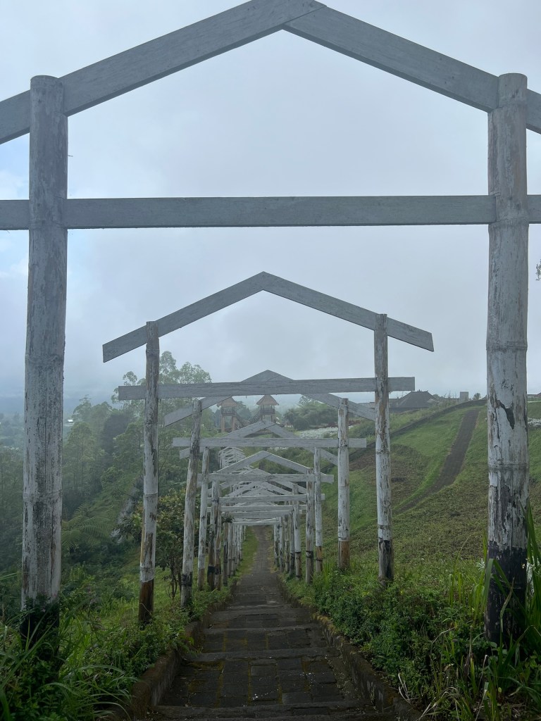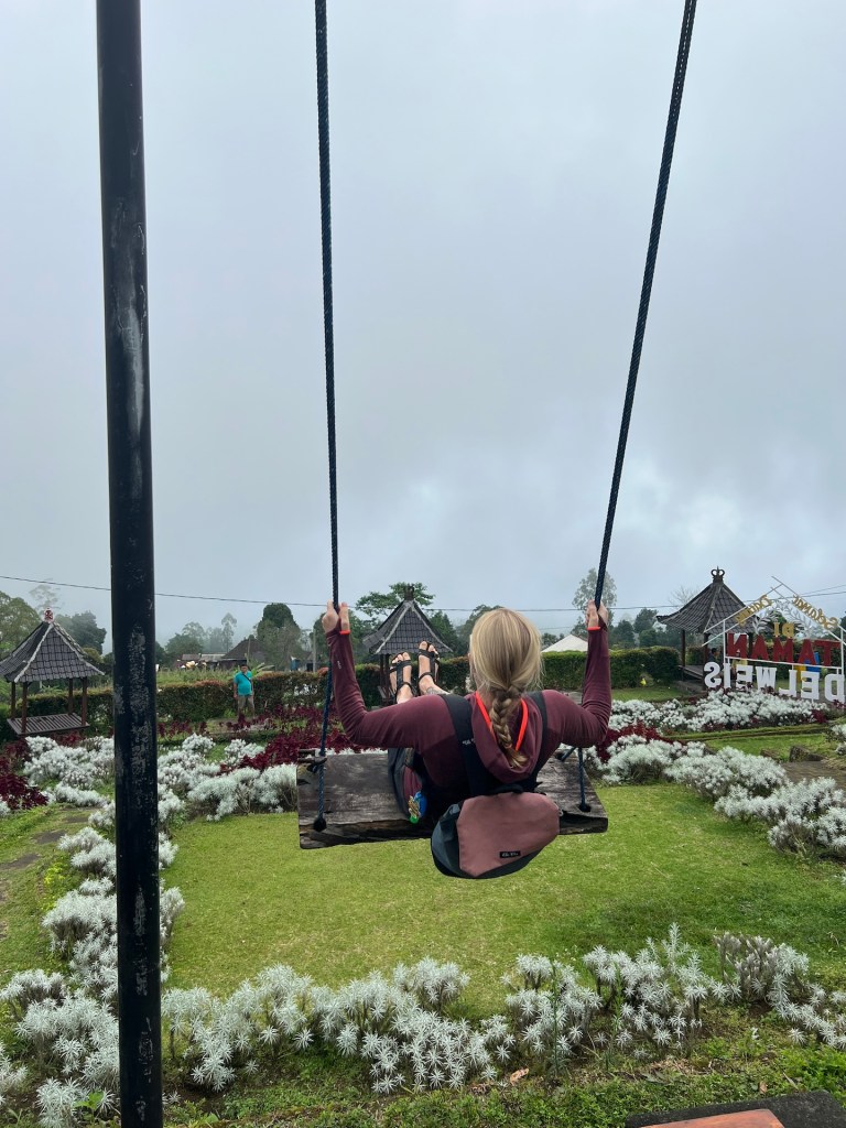 Da wir es bisher nicht auf den Agung geschafft haben, wollen wir heute zumindest so weit wie möglich auf den Berg fahren. Als Ziel haben wir uns einen vielversprechenden Ort rausgesucht. Das Taman Edelweis Bali. 40 Kilometer trennen uns von der anderen Seite des Agungs. Klingt nicht weit, die Strecke zieht sich allerdings über 1 1/2 Stunden. Dazu beginnt es zwischendurch zu regnen. Wir kommen gegen 15 Uhr am Ziel an. Die Wolken hängen leider immer noch am Berg, so dass wir leider keine besonders gute Aussicht haben. Wir sind gespannt auf den Park des Taman Edelweis. Wir zahlen etwa drei Euro Eintritt pro Person und sind dann mäßig enttäuscht. Die Anlage war bestimmt mal schön. Heute ist sie runtergewirtschaftet und wirkt verwahrlost. Einige Beete sind noch schön gestaltet, es wachsen riesige Buntblätter und irgend ein weißblättriges Kraut. Der Kontrast ist ganz nett anzusehen. Jana tobt sich noch auf einer wackeligen Schaukel aus, bevor wir einmal durch die Anlage schlendern. Zwischendurch kommt die Sonne raus und kitzelt uns im Gesicht. Wir erinnern uns auf den letzten Metern hier hoch an einem interessanten Tempel vorbeigekommen zu sein. Da war nicht viel los, lass uns dahin aufbrechen.