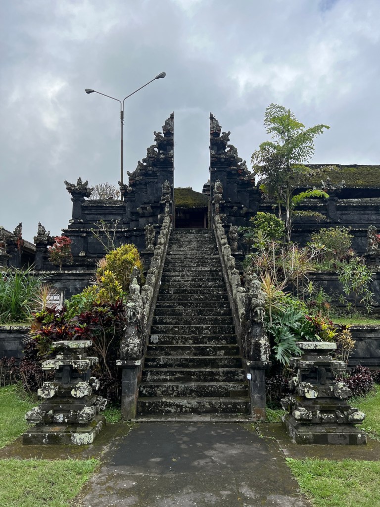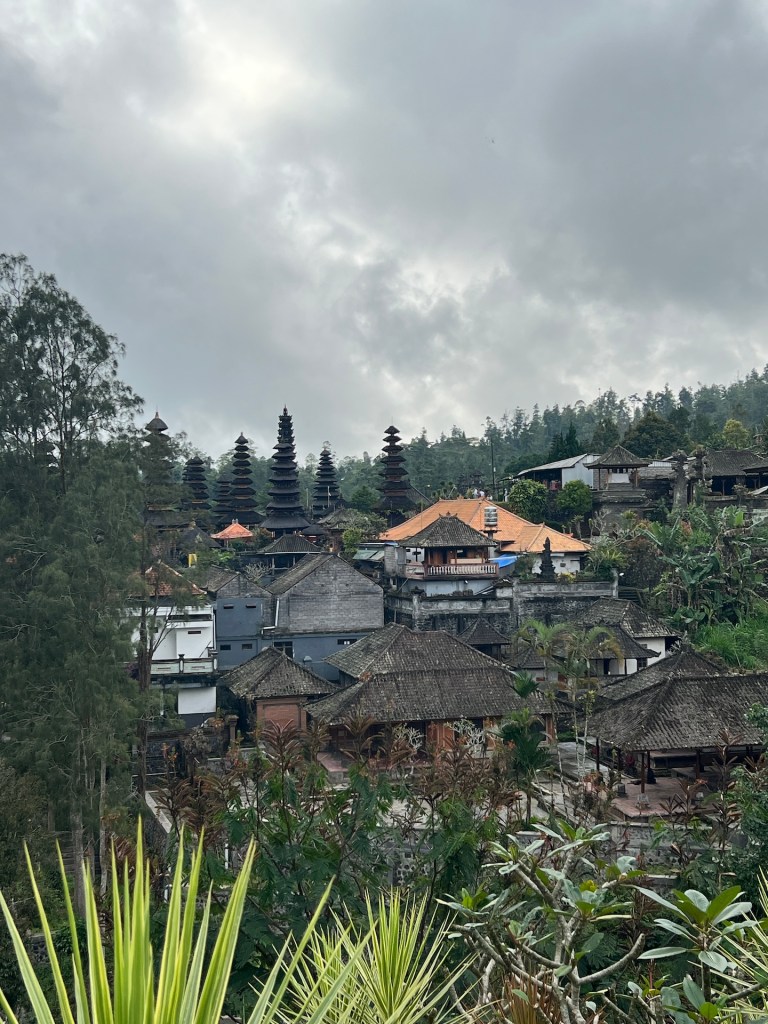 Gesagt, getan. Noch eben für den Parkplatz bezahlen, dann rollen wir auch schon weiter. Bis auf zwei bastelnde Kinder haben wir den Tempel komplett für uns alleine. Der Tempel ist anders als die die wir bisher auf Bali gesehen haben. Besonders interessant sind die Dächer. Hoch, spitz und mit mehreren Strohdächern ausgestattet. Da wir hier niemanden beim Beten stören betreten wir das Tempelinnere und schauen uns in Ruhe um. Beim Verlassen des Geländes entdecken wir auf der anderen Seite eines Tals eine ganze Tempelstadt. 23 Tempel zählt die heilige Stätte des Muttertempels Pura Besakih. Von Ayah haben wir bereits einiges von dem Ort gehört, jetzt stehen wir zufällig davor. Leider ist es schon zu spät, um die Anlage zu besichtigen, außerdem müsste man auch einen Guide buchen. Wir freuen uns trotzdem einen Blick geworfen zu haben.