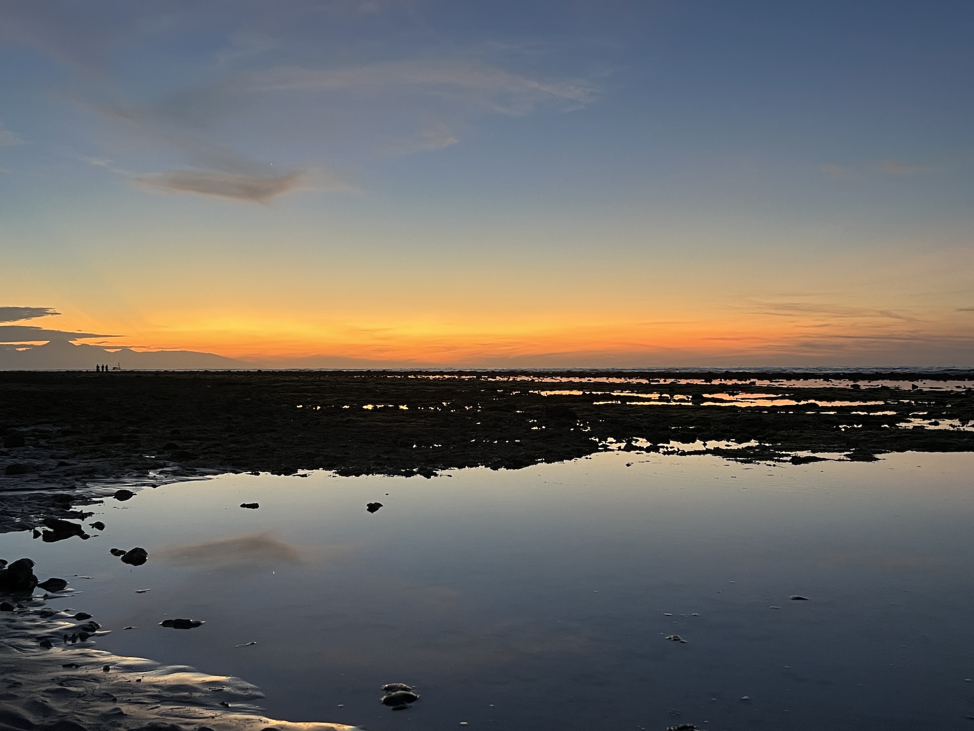 Freitagmorgen. Wir haben uns extra den Tidenkalender angeguckt und den Wecker entsprechend gestellt. Noch vor dem Frühstück sind wir am Wasser. Ein kleines Dejavu, die Flut steht hoch und die Wellen brechen etwa so, wie vor kurzem in Amed. Auch wenn wir liebend gerne die Unterwasserwelt vor Trawangan erkunden würden, entscheiden wir uns vorerst für den Pool. Wir ziehen einige Bahnen, duschen und gehen dann zum Frühstück. Vielleicht beruhigt sich das Meer ja noch etwas und wir können es später noch einmal probieren. Mit dieser Überlegung setzen wir uns erst einmal an unsere Projekte. Wir arbeiten vor uns hin und vergessen dabei völlig die Zeit. Als wir aus unserer Trance wieder zu uns kommen ist sozusagen Ebbe. Also verschieben wir das schnorcheln auf morgen und kümmern uns jetzt erst mal um Abendessen. Nicht weit von unserem Hotel hat Hong’s Kitchen tolle Sitzgelegenheiten direkt am Wasser. Die Küche reicht von westlichem über indonesischem bis zu koreanischem Essen. Während wir unsere Mahlzeit genießen stellen wir fest den perfekten Ort für den Sonnenuntergang gefunden zu haben. Wir wechseln vom Tisch in die Liegen des Restaurants, genehmigen uns alkoholfreie Cocktails und genießen das Schauspiel. Am Horizont können wir die den Agung auf Bali erkennen, direkt daneben trifft die Sonne auf die Balisee und versinkt tieforange. So geht der Freitag recht ereignislos aber produktiv zu Ende. Wir sind damit sehr zufrieden.