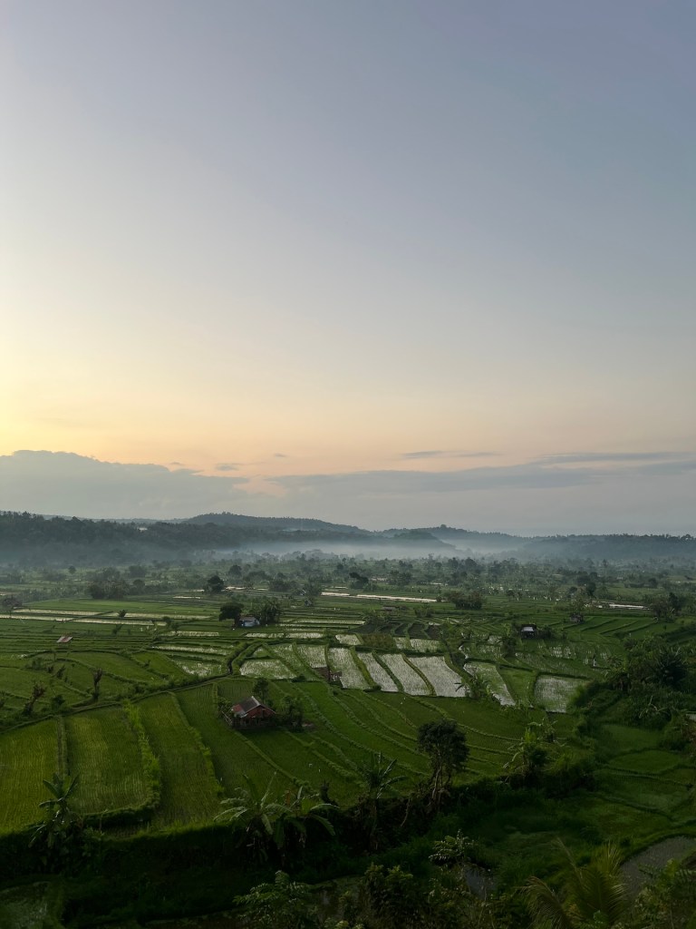 Um 05:30 Uhr klingelt der Wecker, es ist noch dunkel draußen, trotzdem werden wir schnell wach. Die Rucksäcke sind eben so gepackt, da kommt bereits ein freundlicher Mitarbeiter vom Hotel und hilft uns dabei alles im wartenden Taxi zu verstauen. Das hat schon einmal sehr gut geklappt. Wir benötigen etwa 90 Minuten für die 43 Kilometer zum Hafen. Als die Sonne aufgeht kommen wir an Reisfeldern vorbei, aufsteigender Nebel sorgt für einen tollen Anblick für den wir sogar kurz anhalten. Mehr als rechtzeitig kommen wir am Ticketoffice von Ekajaya Fast Ferry an. Unser Voucher wird in ein Ticket umgewandelt, dann bekommen wir wieder einmal einen Sticker mit unserem Ziel aufs Shirt gedrückt. Das kommt uns bekannt vor 😄 Man teilt uns noch mit, dass wir gegen 08:30 Uhr zur Fähre gebracht werden. Gut, also locker Zeit für einen Kaffee. Kaum hat Christian das Heißgetränk in der Hand, meint ein Mitarbeiter, dass unsere Fähre bereits da sei und wir doch schon einmal zum Hafen laufen sollen. Merkwürdig, aber okay.