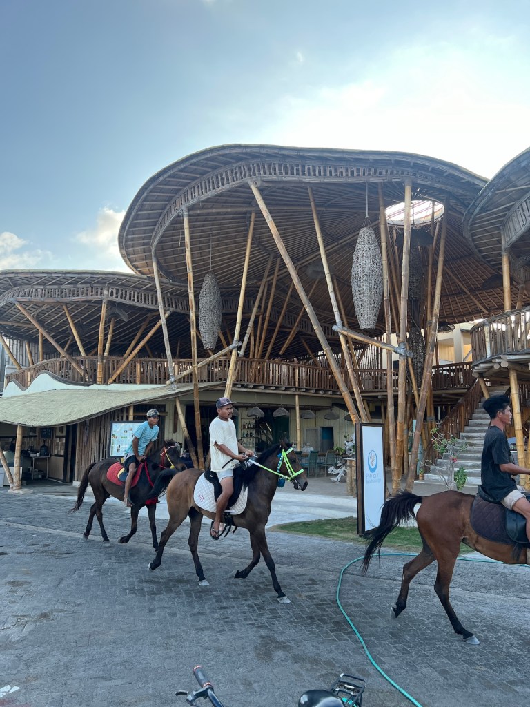 Am Hafen müssen wir uns dann noch einmal gedulden, wir sind mehr oder weniger als erstes eingestiegen, also werden unsere Rucksäcke quasi als letztes ausgeladen. Der Anleger ist rappelvoll und es dauert eine ganze Weile bis wir mit den Menschenmengen den Pier verlassen haben. Bereits erwähnt? Auf den Gili’s sind motorisierte Fahrzeuge verboten. Keine Autos, keine Busse, keine Roller (eigentlich, der ein oder andere Elektroscooter hat es doch geschafft). Zur Fortbewegung gibt es mehr Fahrräder als Einwohner. Gepäck, Kühlschränke und besonders faule Touristen werden per Pferdekutsche transportiert. Für uns geht es erst einmal in ein Café. Das Frühstück war spärlich und bevor wir den Weg in den Norden der Insel zu Fuß bestreiten wollen wir uns stärken. Das Coffee & Thyme hat leckere Drinks und schmackhafte vegetarische Sandwiches. Satt und zufrieden sind wir bereit die zwei Kilometer an der Küste von Trawangan zum Hotel zu laufen. An der Strandpromenade reiht sich ein Restaurant an das nächste. Bars und Liegen laden zum verweilen ein. Jede Bar wirbt damit den besten „Turtle Point“ zu haben. Außerdem fällt uns auf, dass mit jedem Schritt in den Norden weniger Touristen in den Restaurants sitzen.