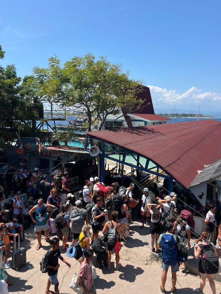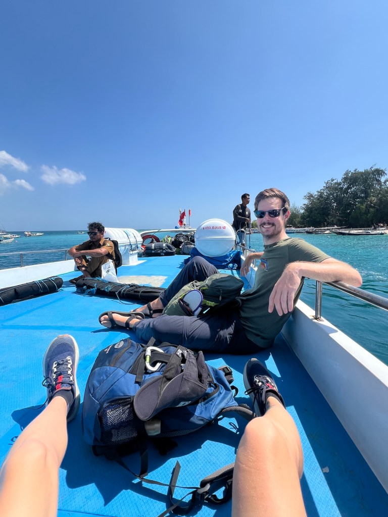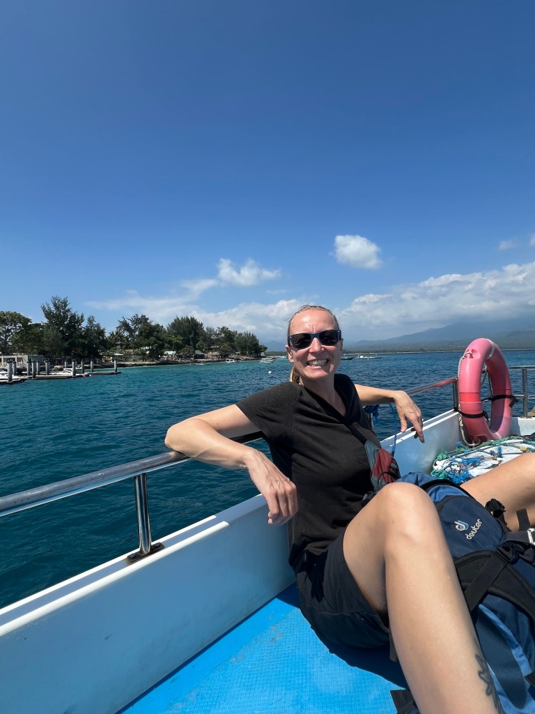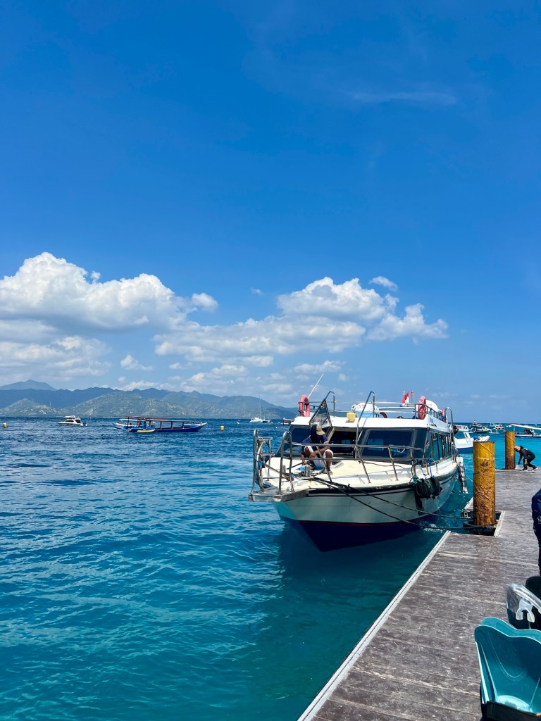 Zehn Minuten vor Abfahrt schlendern wir rüber und dürfen direkt zum wackeligen Steg durchlaufen. Unser Taxiboot ist kleiner, als die Fähre zuvor. Die Backpacks werden auf das Dach gelegt und wir dürfen im Inneren platz nehmen. Jana hat nicht mehr ganz soviel Angst vor Übelkeit. Sie scheint das Schaukeln besser zu vertragen. Wir halten vor Lombok noch bei den beiden anderen Gilis, Meno und Air, an. Nach einer Weile entscheiden wir uns, dem stickigen Innenraum zu entfliehen und setzen uns zu den Matrosen aufs Dach des Bootes. Gicht und Wind sorgen für eine kühle Überfahrt.