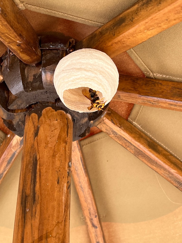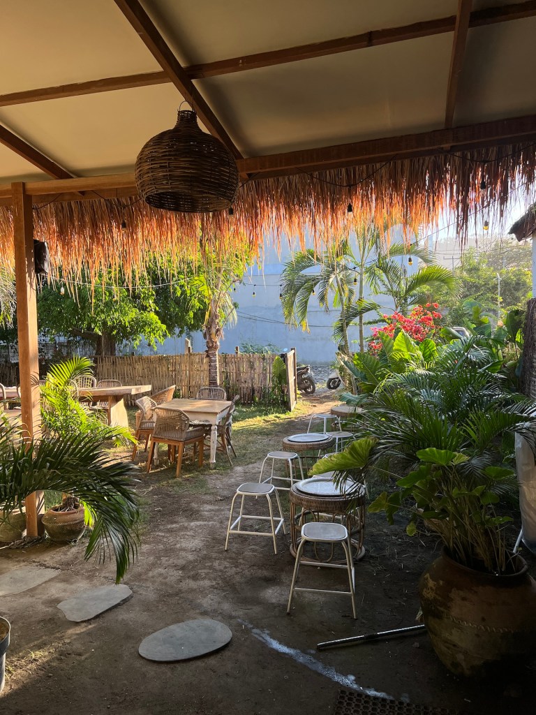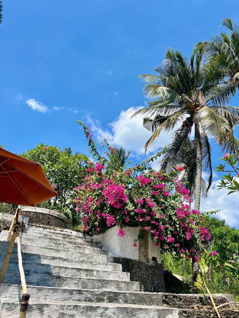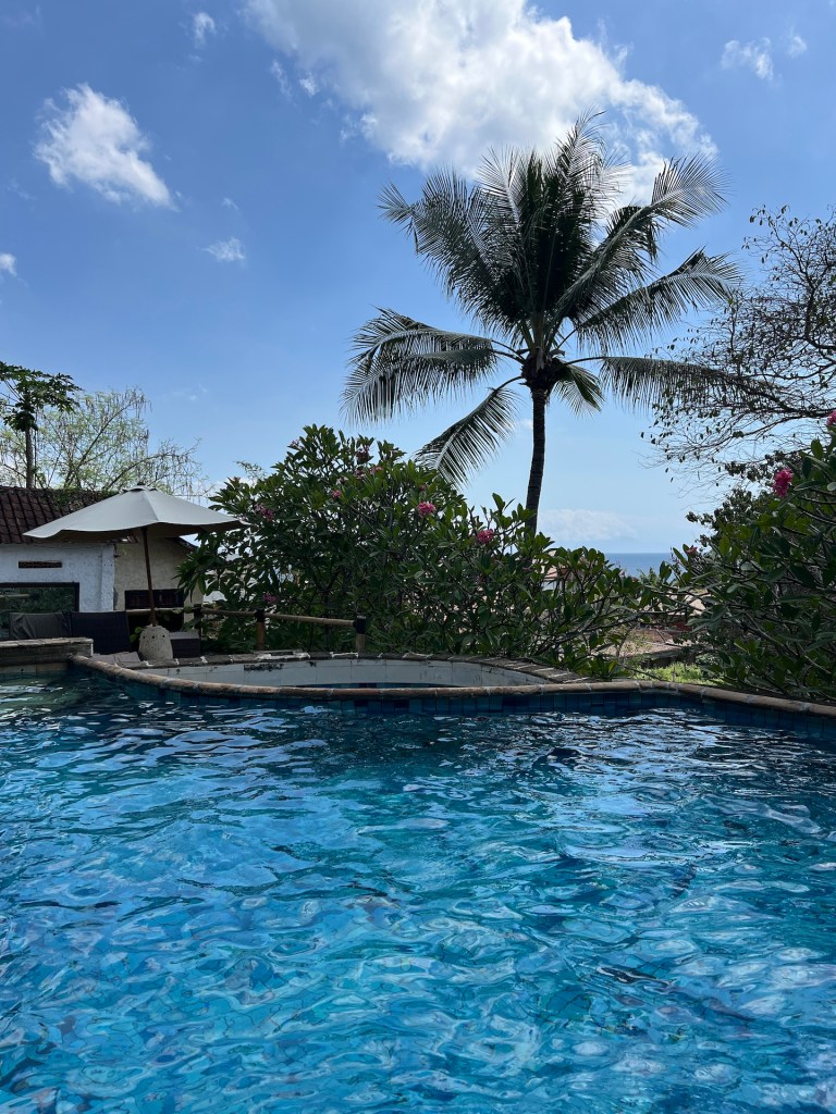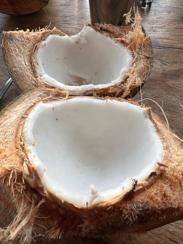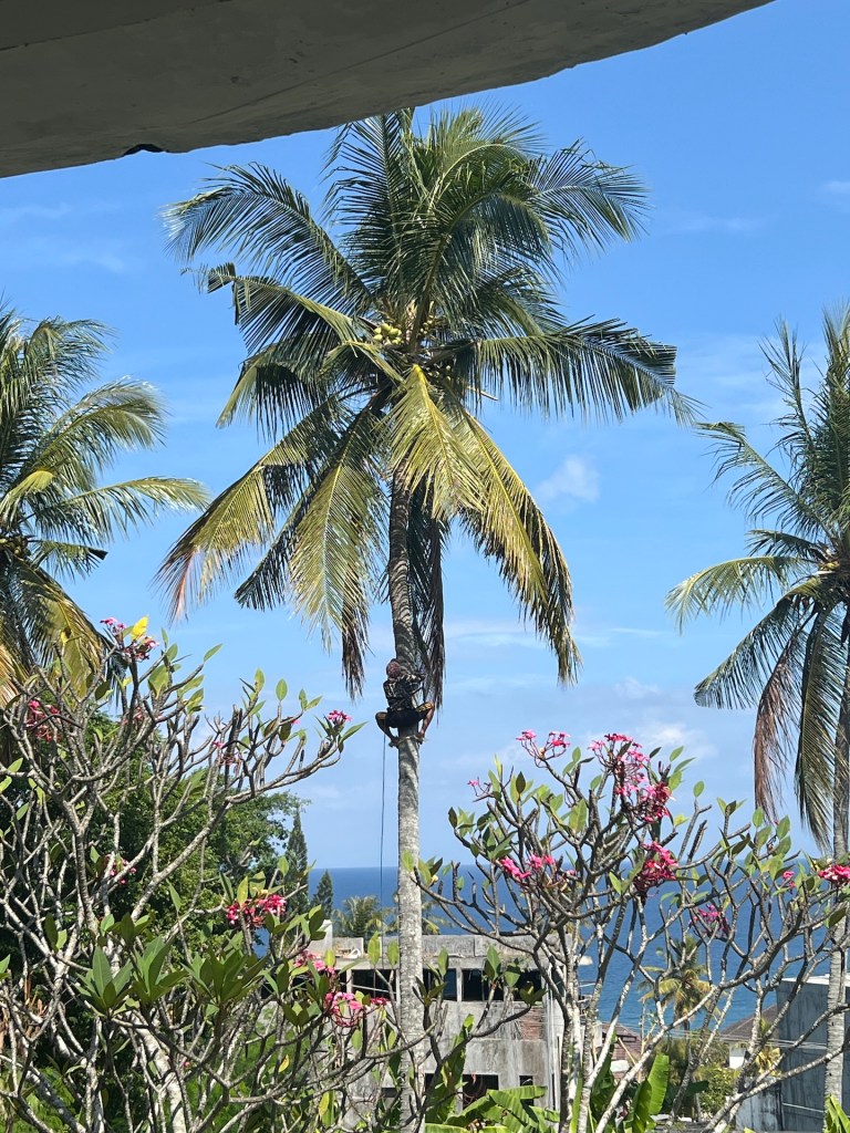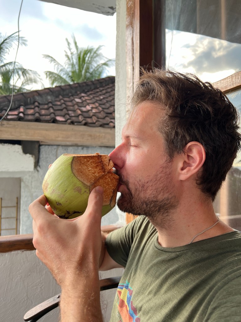 Am nächsten Morgen bekommen wir von Habibi eine neue Matratze, obwohl wir uns nicht beschwert haben. Da fühlen wir uns direkt heimisch. Der Roller wird auch wie vereinbart geliefert. Das läuft. Den Rest des Tages liegen wir am Pool, toben im Pool und entspannen auf unserer Terrasse. Beim Verschieben des Sonnenschirms stören wir eine Ameisenkolonie und ein Wespennest mit einigen Larven die im selbigen schlummern. Gegen Abend treibt es uns doch noch aus unserer Oase. Wir finden ein Warung in Singigi, nur 5 Minuten Fahrt entfernt. Leckeres Essen zu einem schmalen Preis. Perfekt. Zurück im Hotel beobachten wir, wie ein Palmenkletterer, Kokosnüsse aus der Palme schlägt. Wir erfahren, dass das hier ein richtiger Beruf ist. Abends bekommen wir die jungen Kokosnüsse zum Trinken und Snacken. So lecker.