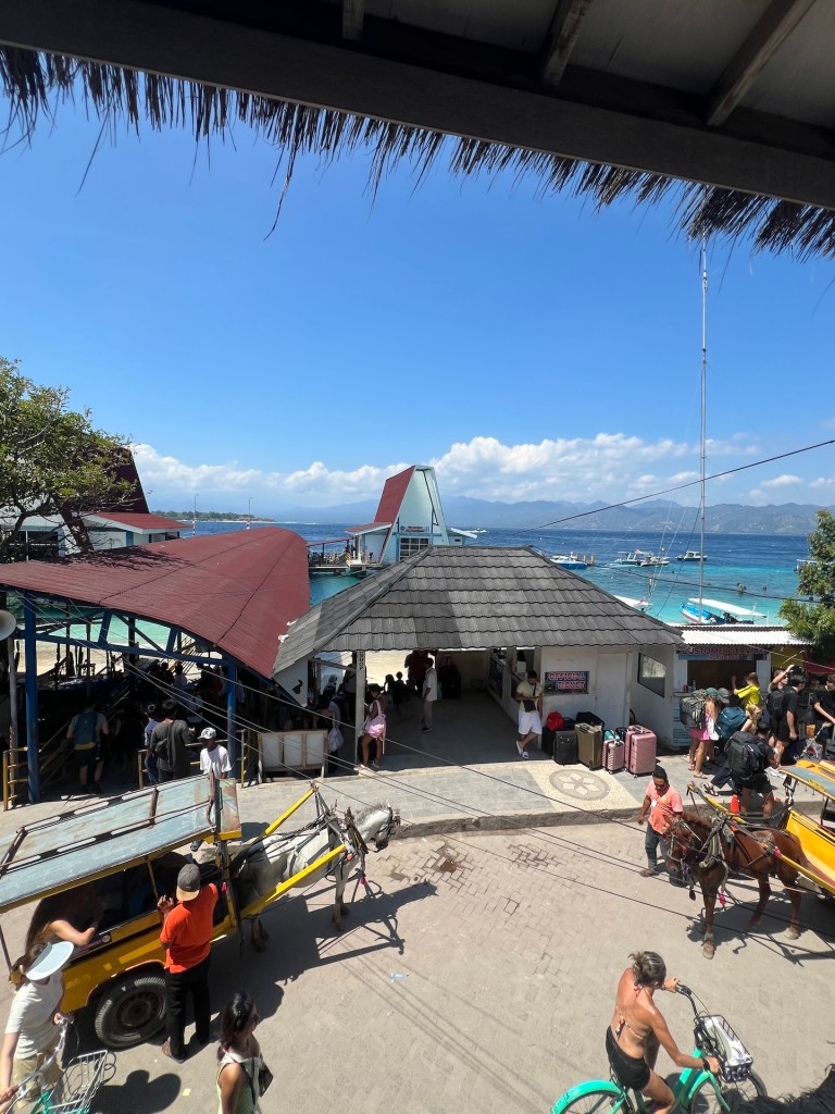 Am Hafen angekommen tauschen wir unsere Onlinereservierung gegen Tickets. Wir haben noch vierzig Minuten Zeit und chillen uns mit Detox-Frucht-Mocktail ins gegenüberliegende Café. Wir beobachten die Abläufe am Hafen und spekulieren, welches unser Taxiboot sein könnte. In den Rezensionen hatten wir gelesen, dass der Hafen sehr chaotisch ist. Irgendwie können wir das abermals nicht bestätigen. Wir erkennen die geordneten Abläufe und wenn die Touristen nicht immer auf der Straße stehen bleiben würden, hätten die umliegenden Pferdekutschen auch keinen Stress. 🤣