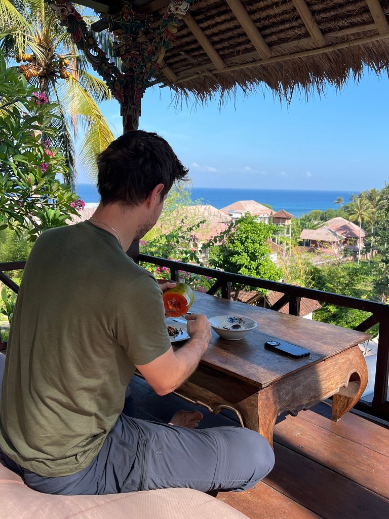 Der nächste Morgen beginnt mit einer freudigen Nachricht. Eine von Janas Kurzgeschichten, die sie in einem Schreibwettbewerb eingereicht hatte, wird in einem Buch veröffentlicht. 🥳 Darauf wollen wir mit fluffigen Pancakes in Kuta anstoßen. Nach dem Frühstück starten wir Richtung Kuta. Die Fahrt dauert fast zwei Stunden und geht mächtig aufs Sitzfleisch. Schonmal nen eingeschlafenen Popo gehabt? 😅 Doch die Pancakes entschädigen einiges.
